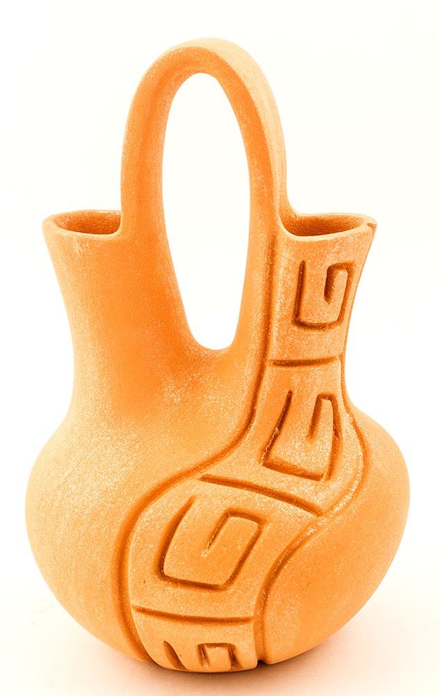 Wedding vase of mica clay, 8.25" x 5". Geometric design. Marcella Yepa was born into the Sun Clan on Jemez Pueblo in 1964. She began working with clay at the age of 19, inspired by her aunt, Alvina Yepa. She gathers her clay and other natural pigments from within Jemez Pueblo. In the traditional way, she soaks the clay, grinds it to a powder, cleans the clay, hand mixes, hand coils, shapes, carves the pottery, polishes her pottery with a stone and fires her pottery outdoors using cedar chips. She hand coils many shapes and sizes of pottery: wedding vases, ollas, and traditional shapes. Date: c.2002 Location: Jemez Pueblo, New Mexico HWAC # 52776