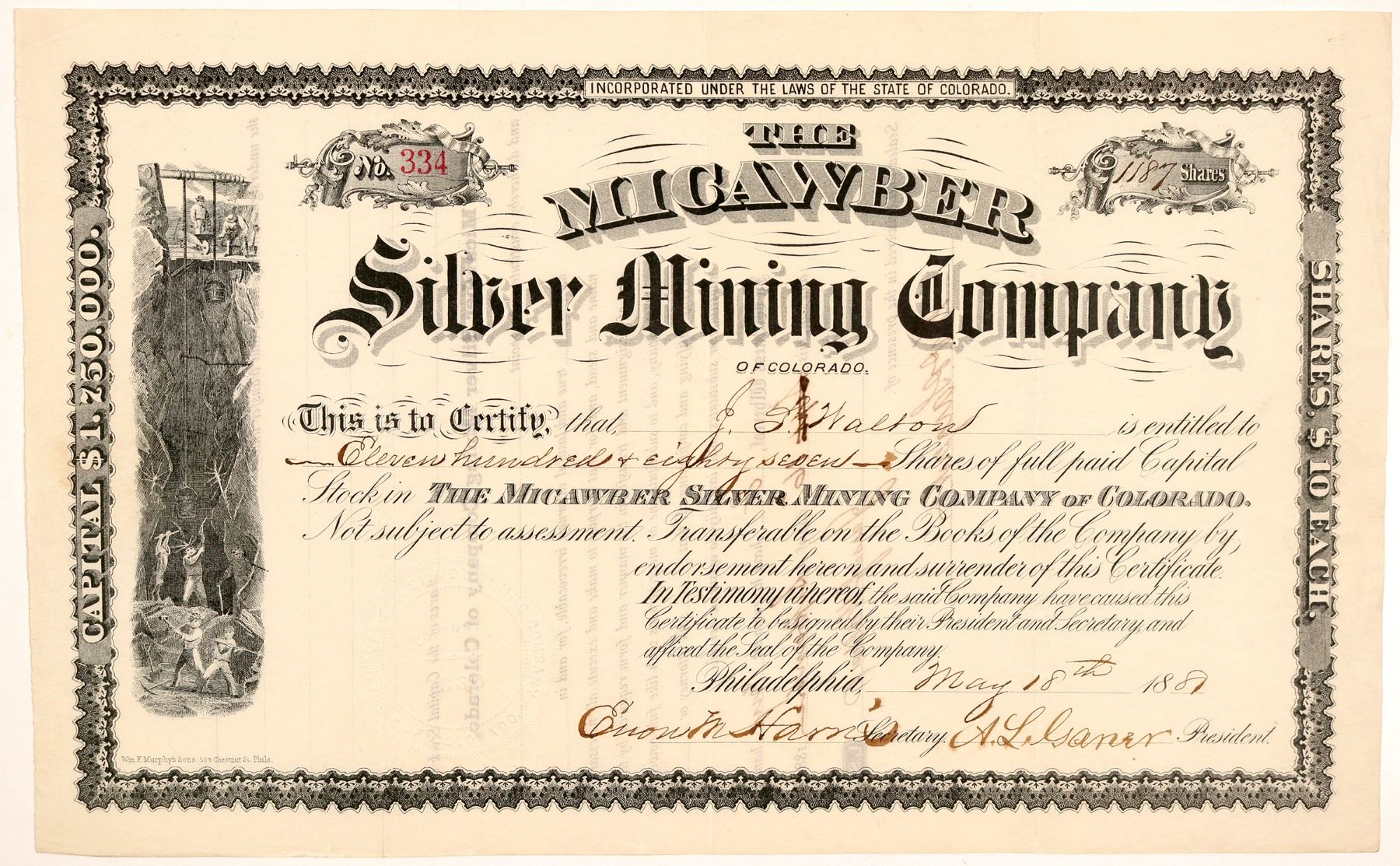 Inc. in Colorado. No. 334, issued for 1,187 shares to J. Walton on May 18th, 1881 in Philadelphia. Signed by president A.L. Ganer and secretary E. Harris. Not cancelled. Black border and print. Vignette of mine hoisting scene. Printed by Wm. E. Murphy's Son, Philadelphia. Folds, creases. 7 x 11.5" The claim was situated on the west slope of Taylor Hill, Eagle Mining District, Eagle County. Located in 1881. Assays one ounce gold per ton. Developed by two shafts (27 and 40 ft.). [Corregan & Lingane, 1883, pg. 246-247] Ken Prag Collection