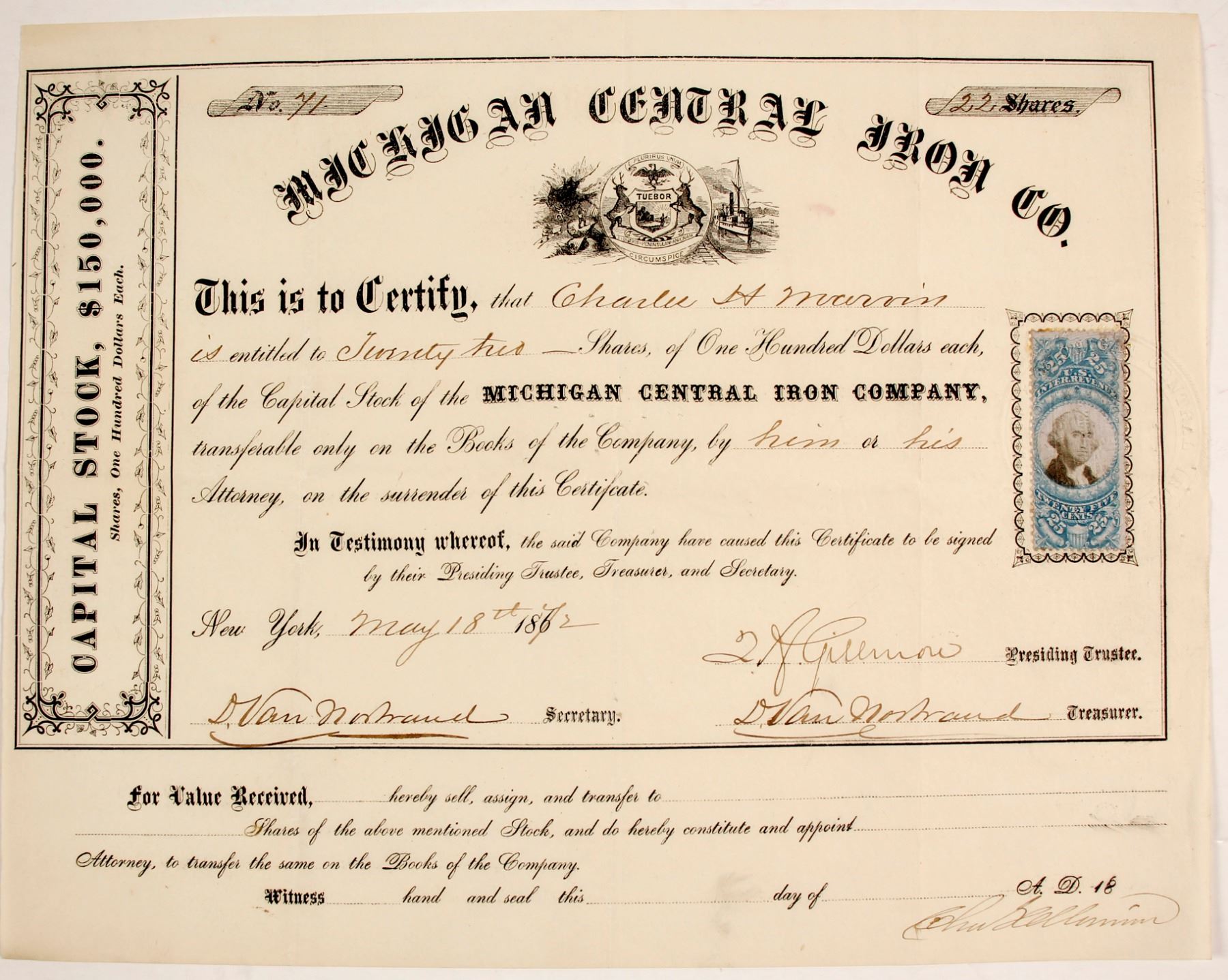 I/U #71 Charlie Marvin 22 shares 1872. 25c revenue stamp. Not listed in Whitney. Prag Collection. City: State: Michigan Date: 1872 HWAC# 82513