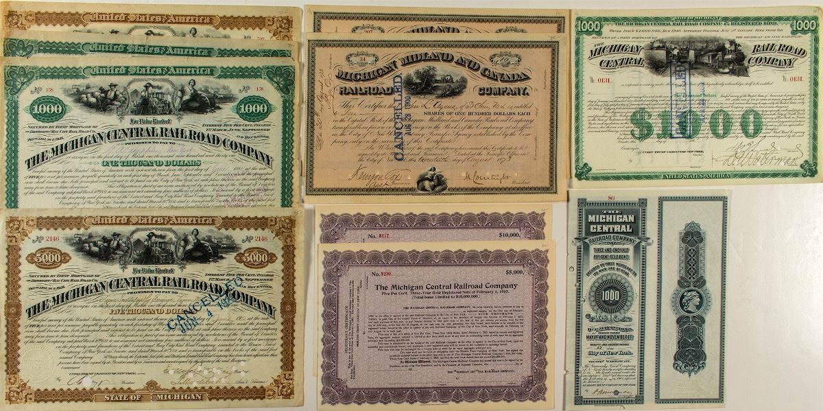 Lot of twelve. 1) Michigan Midland and Canada Railroad Company. Two stocks, one issued 1873 (punch and stamp cancelled) and one unissued. Both feature locomotive over bridge vignette. Printed by NBN. 8" x 12" 2) Michigan Central Railroad Company. Ten bonds. Four unissued, purple background (two $5,000 and two 10,000), all punched. One other unissued $1,000 (189-, pictorial). Five issued, three types: $1,000 (1884 & 1885, punched), $5,000 (1884 & 1902, punched) and a 1902 $1,000, punched. All pictorial. (Prag Collection) City: State: Michigan Date: 1873-1902 hwac# 34500
