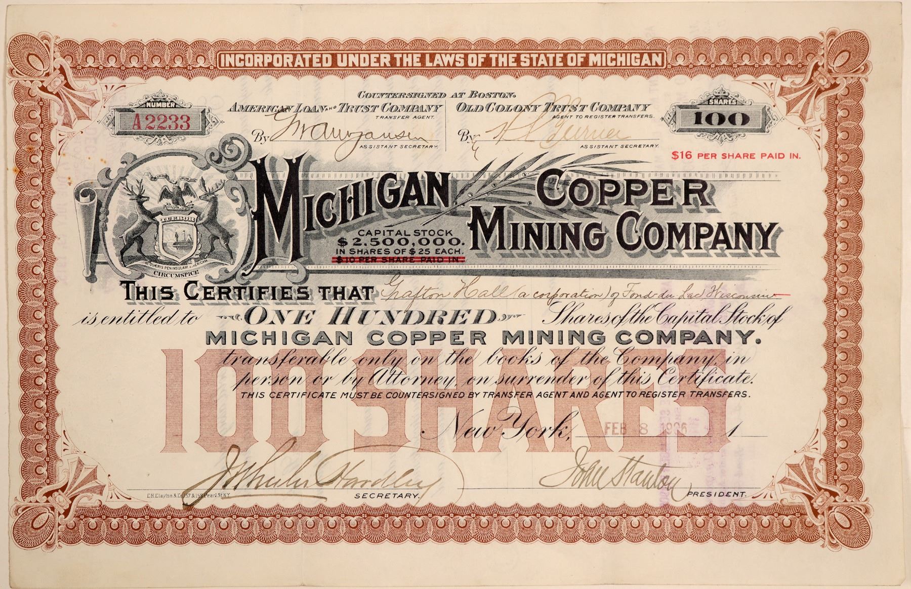 Inc. in Michigan. No. A2233, issued for 100 shares to Grafton Hall on Feb. 8, 1936 in New York. Signed by president John Stautou and secretary J. Hardley. Not cancelled. Maroon border, black print, fancy logo and state seal vignette. Printed by CH Clayton & Co., NY. Heavy folds, pinholes. 7.25 x 11" The Michigan Copper Mining Company was organized January 5, 1899 with a capital of $2,500,000. Its location comprises 6,686 acres and includes 4,870 acres of mineral territory, 1,466 of timber and miscellaneous lands and a 150 acre mill site. Active operations were conducted at Rockland northeast of the center of the county. [Ref:http://genealogytrails.com/mich/ontonagon/ontonagonmines.html] Houghton Estate Collection