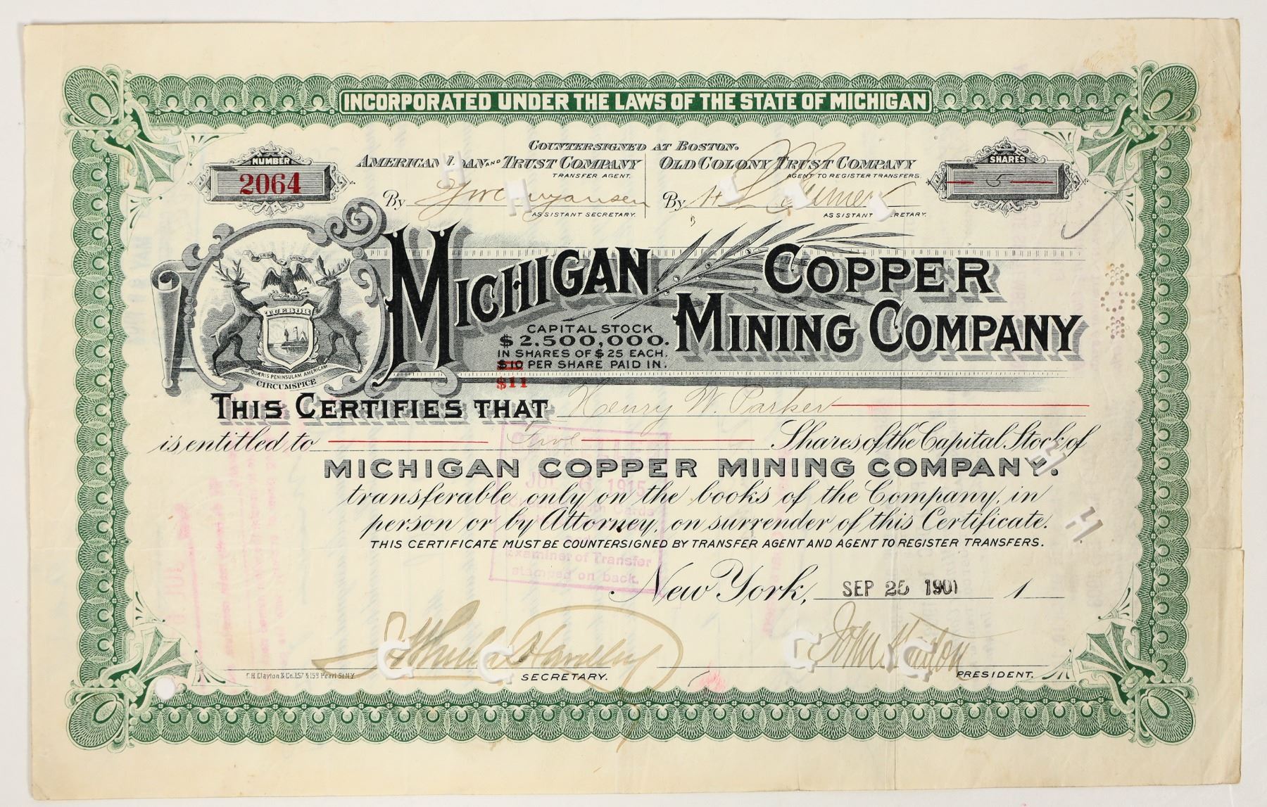 Inc. in Michigan. No. 2064, issued for 5 shares to Henry W. Parker in 1901 in New York. Signed by president John Stanton and secretary Wheeler Hardley. Punch cancelled. Black print, green border. 7.25 x 11.25" DeGood pgs. 235-237. This variety is not shown, but orange and brown border are shown and listed as R-7. Company had 6,288 acres near Rockland. Inc. in 1899.