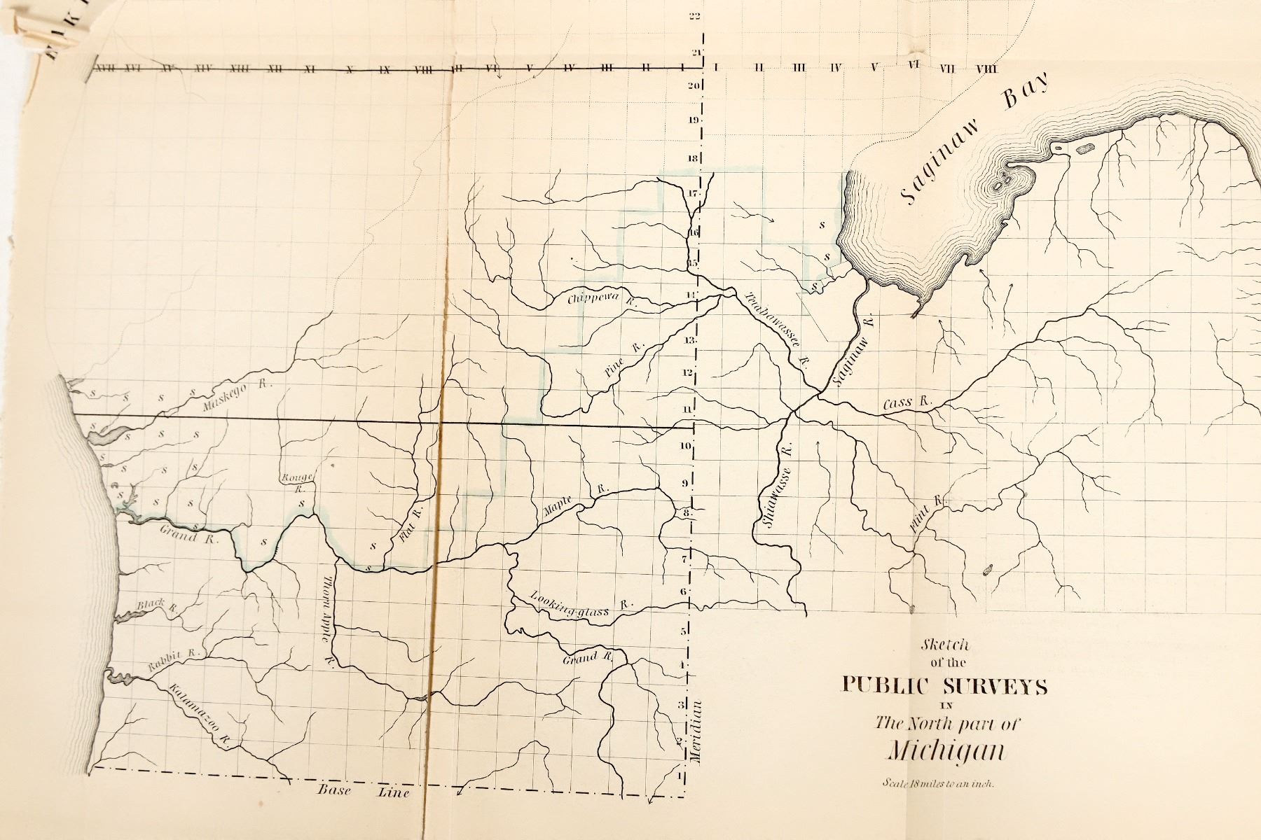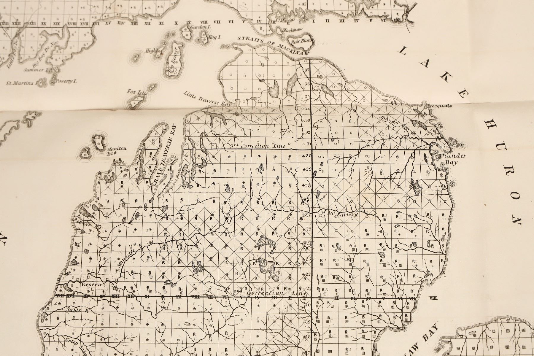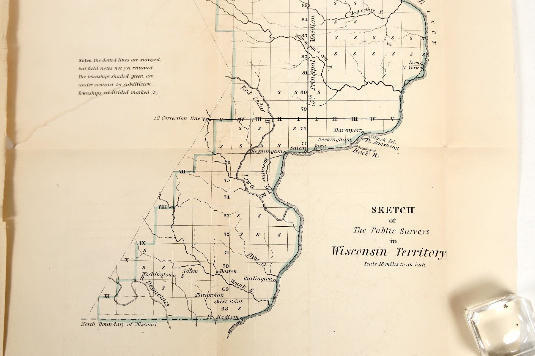 The 1837 GLO map only covers part of Michigan (12 x 16.5") . While very important copper deposits had been found in the 1830s in Michigan, the territory was basically unsurveyed, as is the case with the 1837 map here. A separate map of Wisconsin Territory (12.5 x 9") accompanies this map, showing many towns, particularly in southern and eastern Wisconsin.