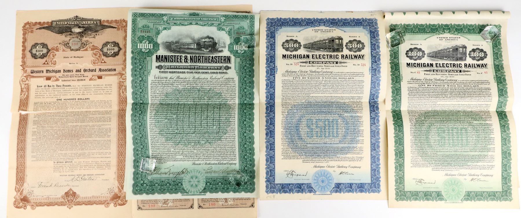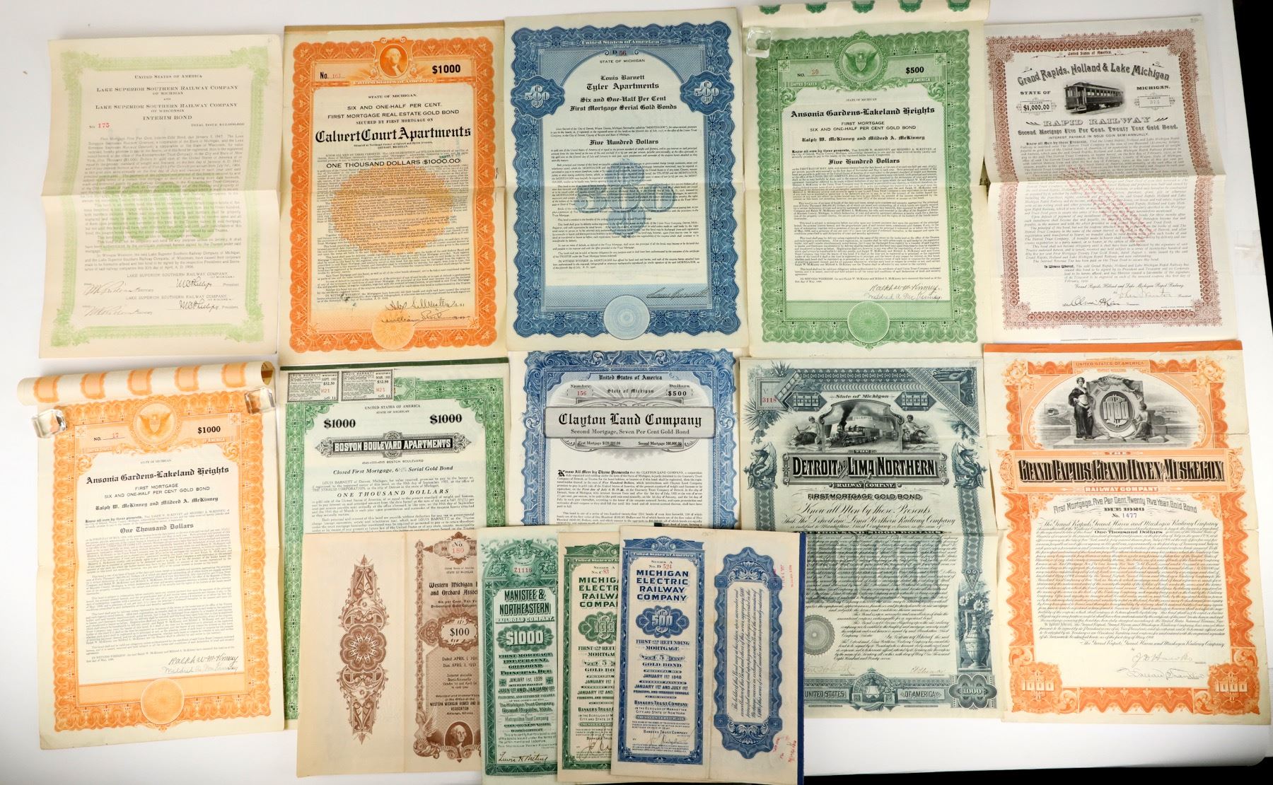Lot of 13 gold bonds from Michigan: Lake Superior Southern Railway (1906); Manistee & Northeastern Railroad due 1939; Western Michigan Homes and Orchard Association (1911); Michigan Electric Railway due 1948 (2); Grand Rapids, Holland & Lake Michigan Rapid Railway (1902); Grand Rapids, Brand Haven and Muskegon Railway (1901); Detroit and LIma Northern Railway (1897); Clayton Land Company (1922); Boston Boulevard Apartments, due 1931; Ansonia Gardens-Lakeland Heights (1926); Tyler Apartments (1926); Calvert Court Apartments (1922).