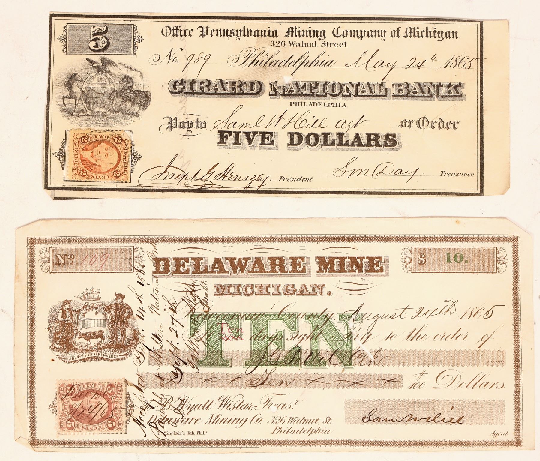 Two pieces: 1) August 24, 1865, Delaware Mine Michigan ten dollar note, with adhesive revenue stamp. 2) May 24, 1865 Office Pennsylvania Mining Company of Michigan five dollar note, with adhesive revenue stamp. [Michigan]