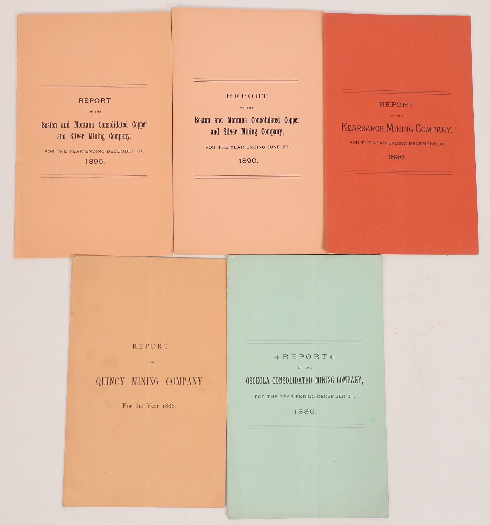 5 Michigan mining reports with assets and liabilities, shaft info and expectations. 1886 Osceola Cons. Mining-vertical crease. 1886 Quincy Mining-vertical crease. 1896 Kearsarge Mining with foldout map and vertical crease. 1890 Boston and Montana Cons Copper and Silver with foldout map. 1896 Boston and Montana Cons Copper and Silver-vertical crease. Michigan