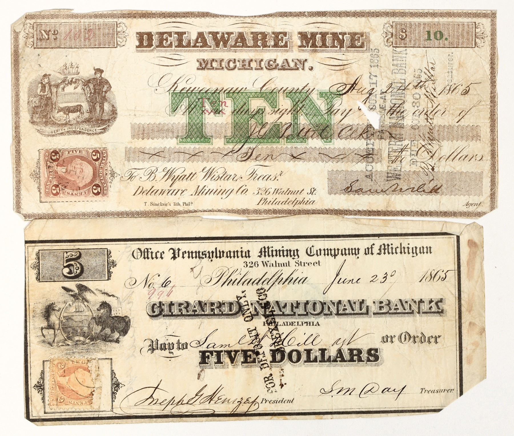 Two pieces of Michigan mining scrip: 1865 Delaware Mine ten dollar note with adhesive revenue stamp; 1865 Office Pennsylvania Mining Company of Michigan five dollar note drawn on the Girard National Bank of Philadelphia, with adhesive revenue stamp. Both with vignettes.