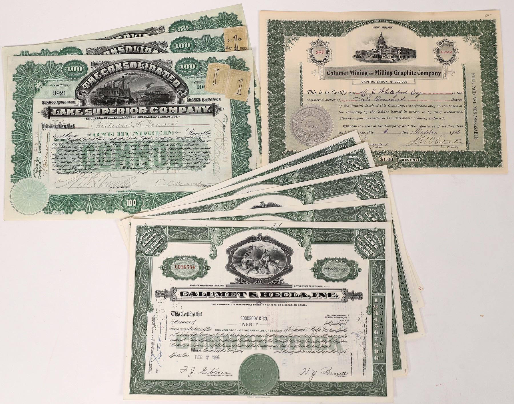 Lot of 9. 1) Calumet Mining and Milling Graphite Company. Inc. in New Jersey. Operated in the Grenville district of Quebec. Stock issued in 1906 for 2,000 shares, not cancelled. Signed by the president and treasurer. Capitol building vignette. 2) The Consolidated Lake Superior Company. Controlled various hydraulic, manufacturing, and railway enterprises centering about the great waterfall at Sault Ste. Marie. Inc. in Connecticut. Three stocks issued 1901-02. Not cancelled. Green border and mining/locomotive vignette. Signed by the vice president and asst. treasurer. Franklin-Lee Bank Note Co. 3) Calumet & Hecla Inc. Famous producer that dates back to the 1860s. Inc. in Michigan. Five stocks issued 1961-66. Native American vignette.