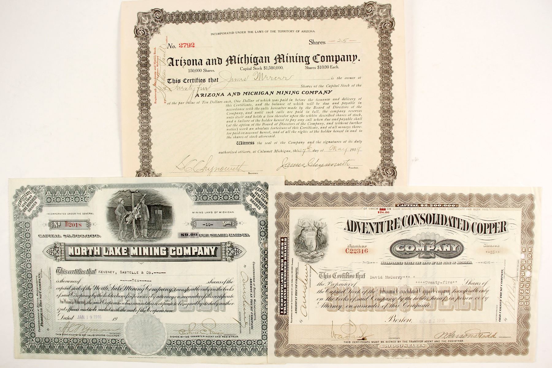 Three issued uncancelled mining stocks: Arizona and Michigan Mining Co, 1909; North Lake Mining Co, 1916; Adventure Consolidated MC, 1916. Ken Prag Collection