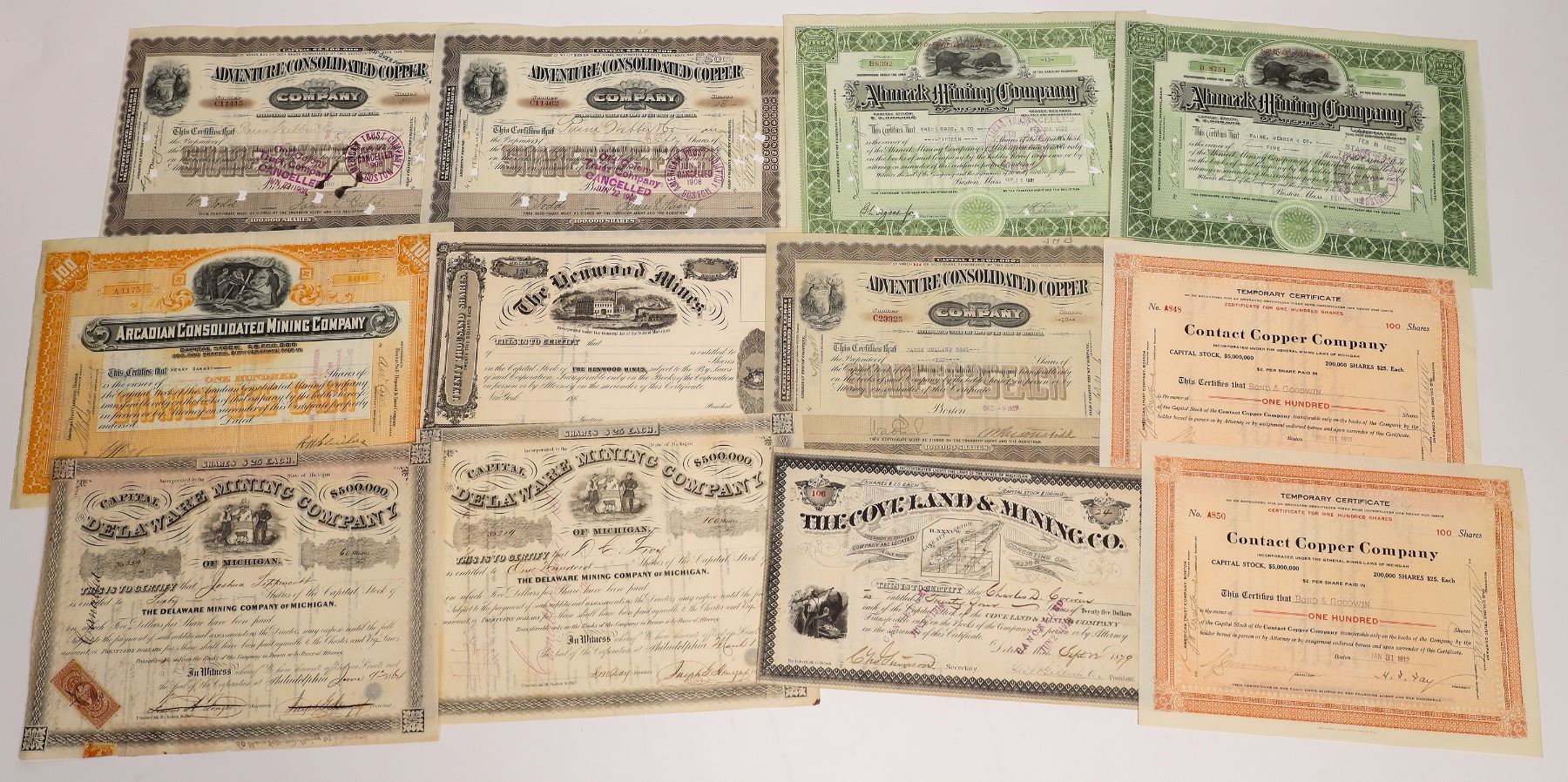 Lot of 12 mining stock certificates from Michigan. Adventure Consolidated Copper; Ahmeek Mining; Henwood Mines; Arcadian Consolidated Mining; Contact Copper Company; Cove Land & Mining; Delaware Mining Company (1864) (2). State:Michigan City: Date: Provenance: Ken Prag Collection