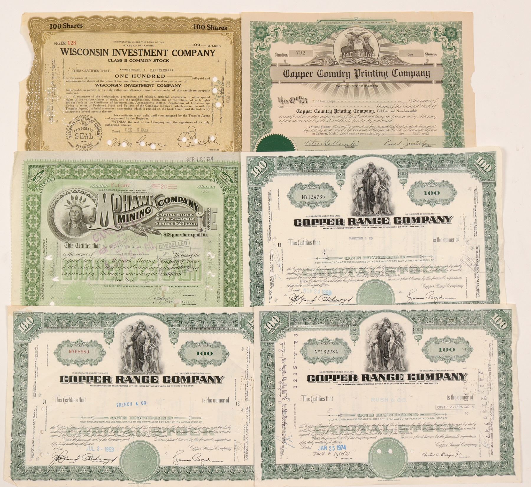 6 issued Michigan stocks. Mohawk Mining-creased, Copper Country Printing-rough condition, Wisconsin investment Co-poor condition, 3 Copper Range Co stocks, 1963-74-fair condition.Houghton Estate Collection