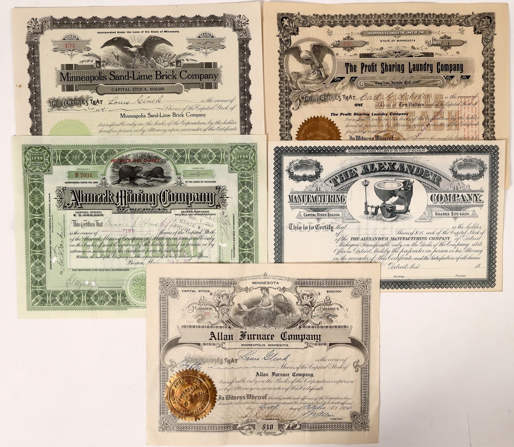 Lot of 5 different. Michigan: Ahmeek Mining Company (1920 with beaver vignette); and Alexander Manufacturing Company (1800s, Detroit, unissued, vignette of machine). Minnesota: Profit Sharing Laundry Company (1904); Minneapolis Sand-Lime Brick Company (1912); and Allan Furnace Company (Minneapolis, 1914).
