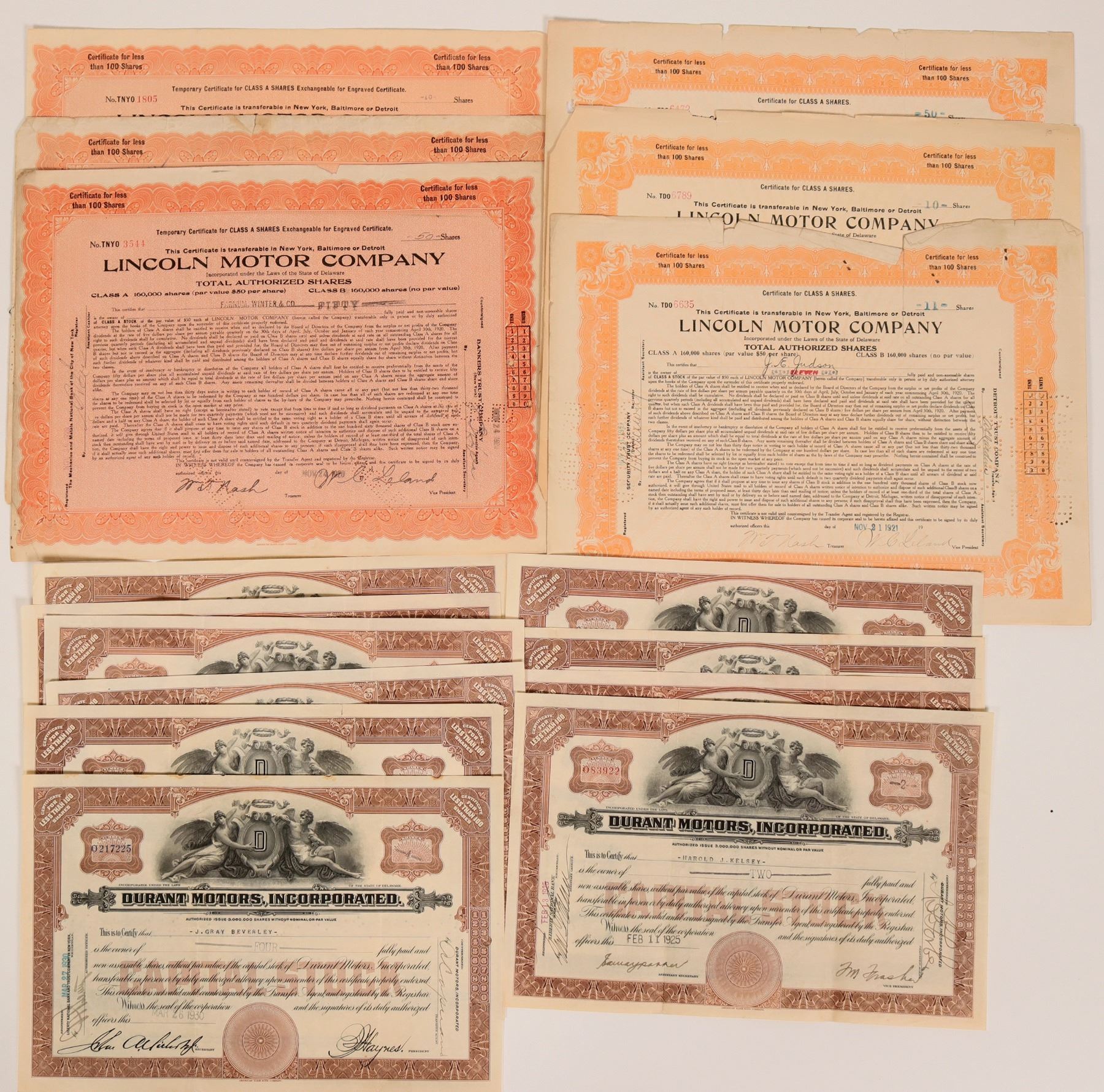 1. Lot of 6 issued pieces. Issued 1920-1921. All cancelled. Orange border and background, black print. Condition issues; please inspect. 9.5 x 13" Lincoln Motor Company was founded in 1917 by Henry M. Leland, naming it after Abraham Lincoln; in 1922, Lincoln was acquired by Ford. Lincoln has the distinction of establishing the personal luxury car segment, with the entry of the Lincoln Continental into mass production in 1940. 2. Lot of 10 issued stocks. Issued 1922-1931, not cancelled. Brown border, black print, and allegorical vignette of two angels holding the company logo. Printed by ABN. Folds, creases, some toning. 7.5 x 11.5" Established in 1921 by former General Motors CEO William "Billy" Durant. Operated until 1931 in Lansing, MI.