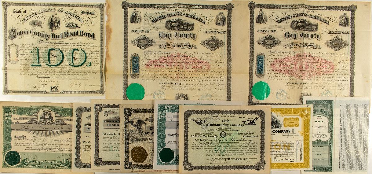 Lot of 14. 1) Best are two 1867 Bay County bonds ($500) both punch cancelled with multiple vignettes and an adhesive revenue stamp. 13.75" x 17" with folds, creases, ripped edges and soiling. 2) 1865 Eaton County Railroad Bond ($100) stamped paid. Allegorical vignette. Western Engraving Co., Chicago. 11" x 12" with folds and small tears. 3) The rest: Goebel Brewing Co. (1964 stock, cxl), Gale Manufacturing Co. (1911, pen cxl), City of Muskegon Heights Water & Sewer Bond (1958, punched), Engineer Development Co. (1918, not cxl), Glazier Stove Co. (1907, not cxl), The Alabama Land & Timber Co. (1911, pen cxl), Saginaw Broadcasting Co. (unissued), Michigan Radio Corp. (1923 & 1924, not cxl), and others. Please inspect. (Prag Collection) City: State: Michigan Date: 1865-1964 hwac# 34479