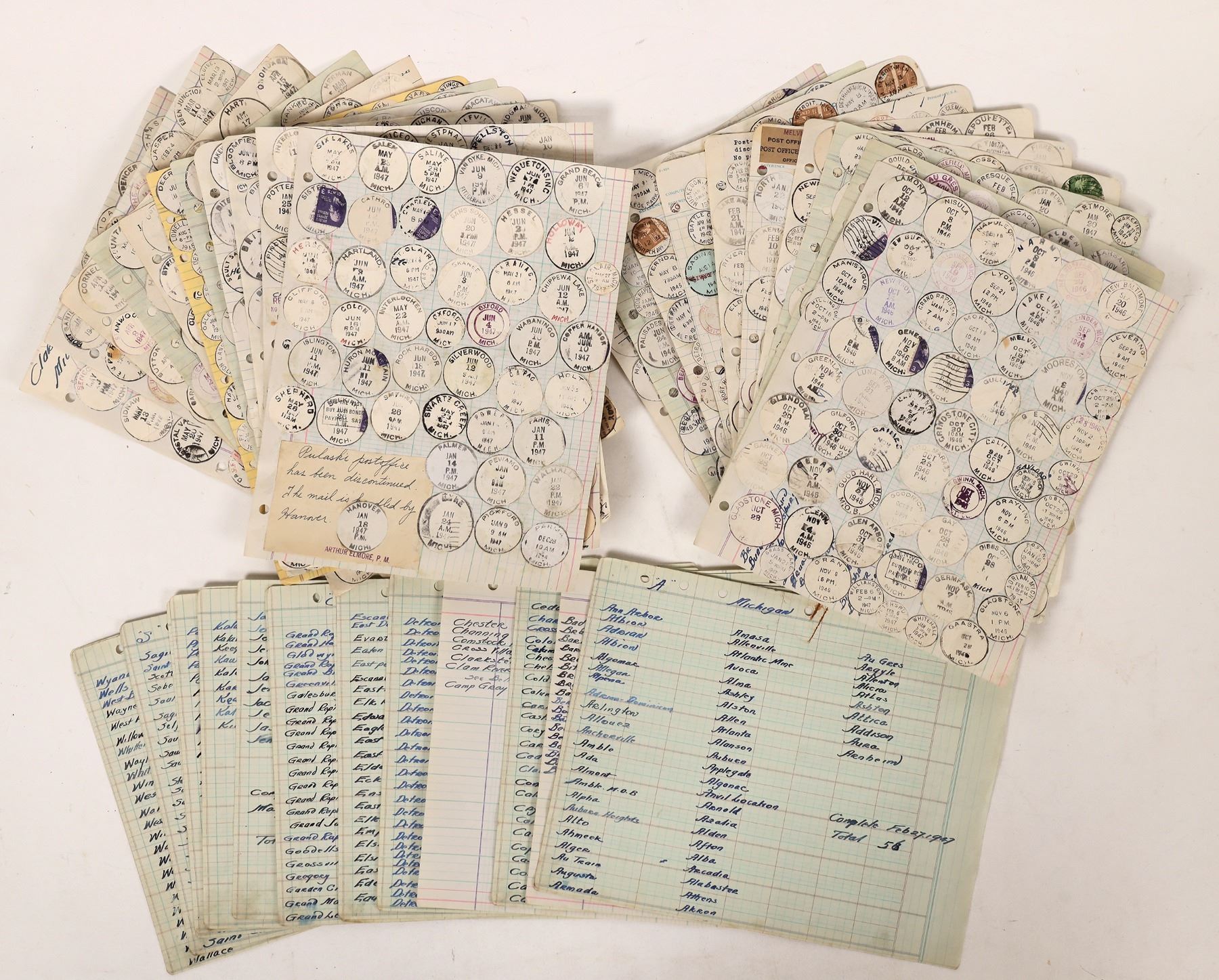 About 1175 Michigan cut out postmarks adhered to pages. c. 1946-47. Includes separate index pages. Michigan