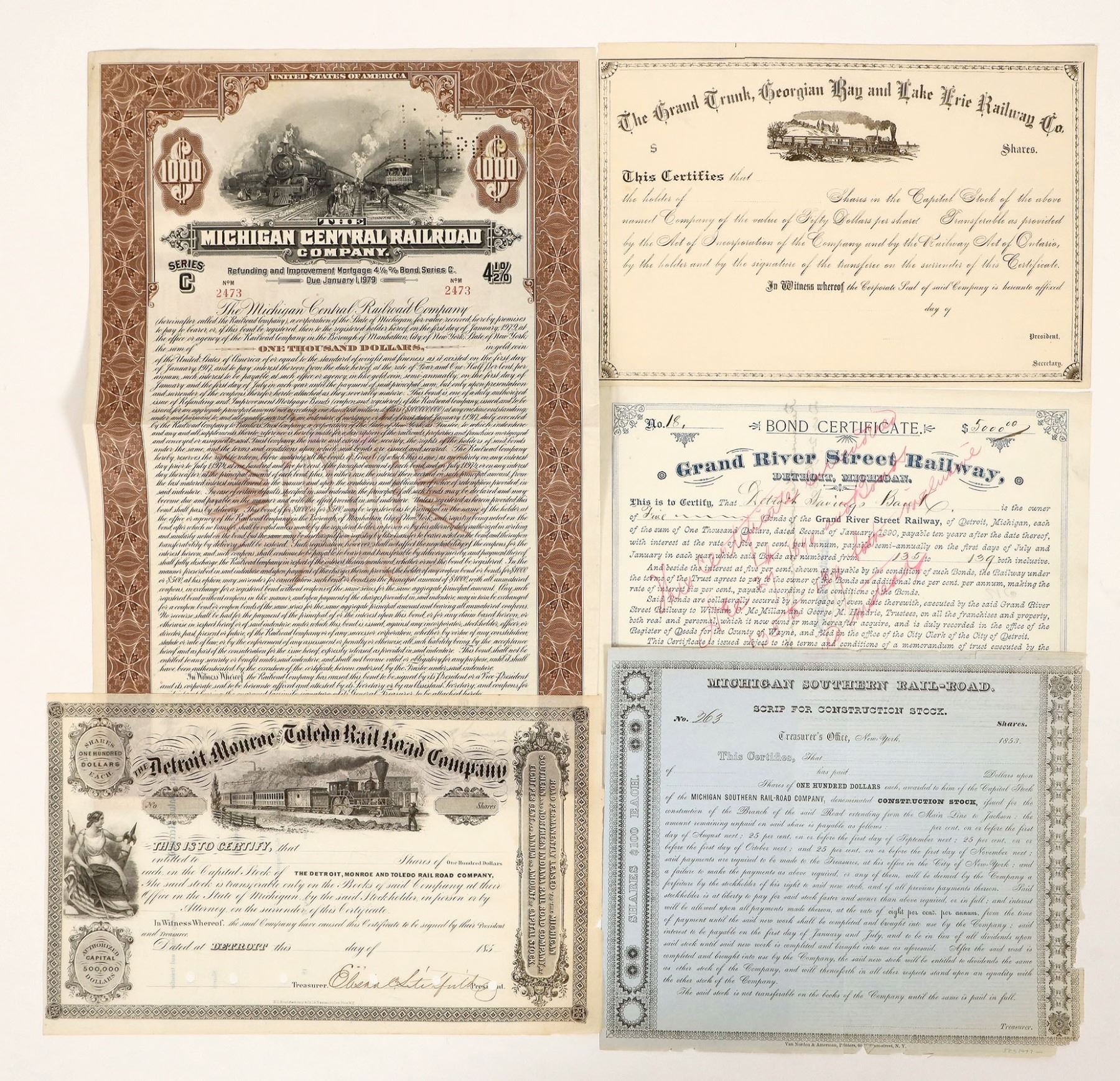Collection of five stock certificates from various Michigan railroad companies, dating from 1853 to 1929. The companies in question are the Michigan Southern Railroad; Detroit, Monroe, and Toledo Railroad Co.; Grand River Street Railway; Grand Trunk, Georgian Bay, and Lake Erie Railway Co.; and the Michigan Central Railroad Company. Three of the five stocks are unissued. The Grand River certificate has been cancelled using a hole punch cancellation. All stocks are in good condition.