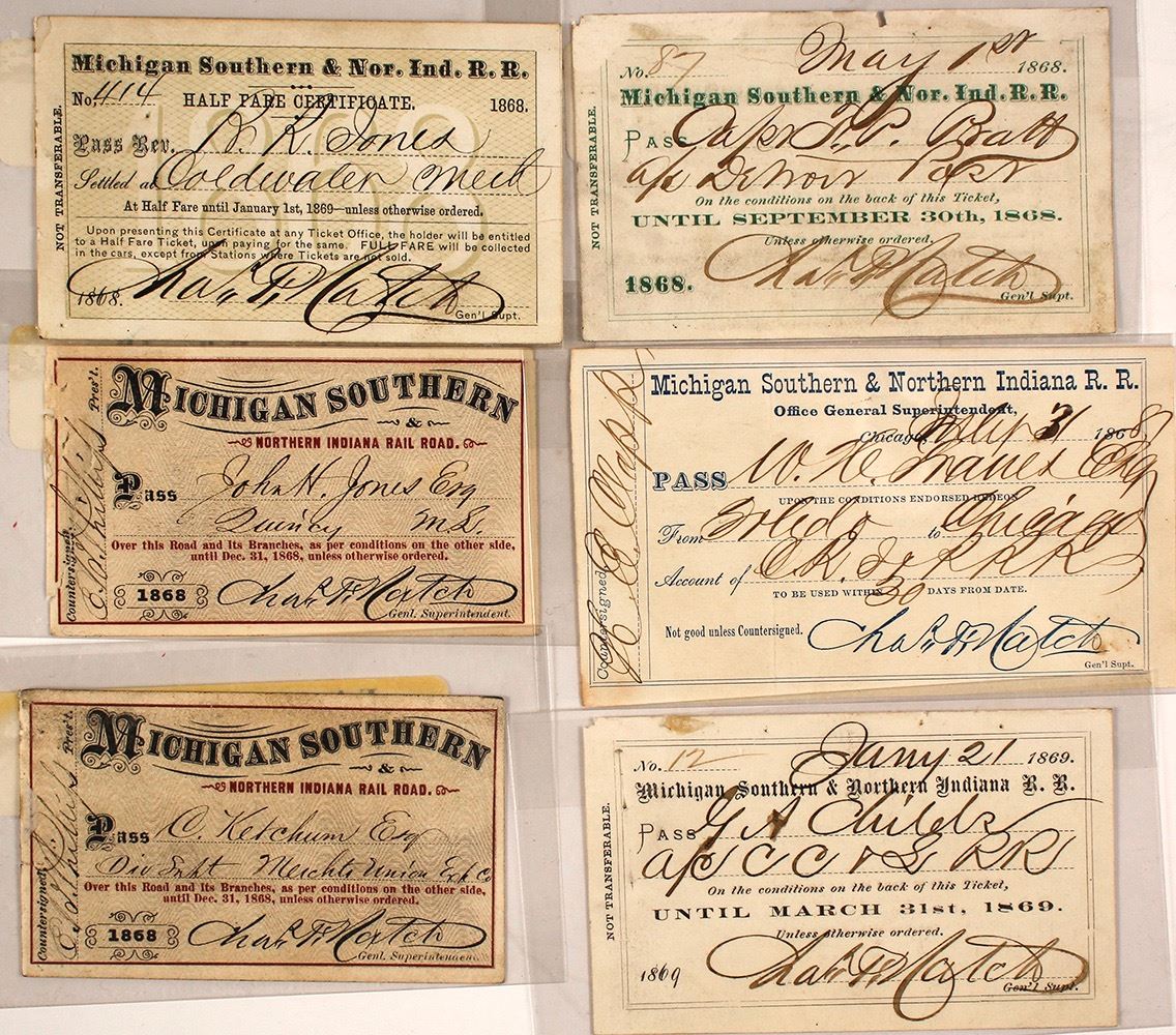 Lot of 6 passes. Five are issued for 1868 and one is issued for 1869. Five different styles! Two of them have a map on the reverse! All list Charles Hatch as general superintendent. Good to very good condition. In 1855, the Michigan Southern Railroad consolidated with the Northern Indiana Railroad and became the Michigan Southern and Northern Indiana Railroad, still including the Palmyra and Jacksonburgh Branch line. The MS& NI RR consolidated with the Lake Shore Railway in 1869 and became the Lake Shore and Michigan Southern Railroad. Later in 1869, the Railroad joined the Buffalo and Erie Railroad. (Potter Collection) Date: 1868-69 Location: Michigan HWAC# 60368