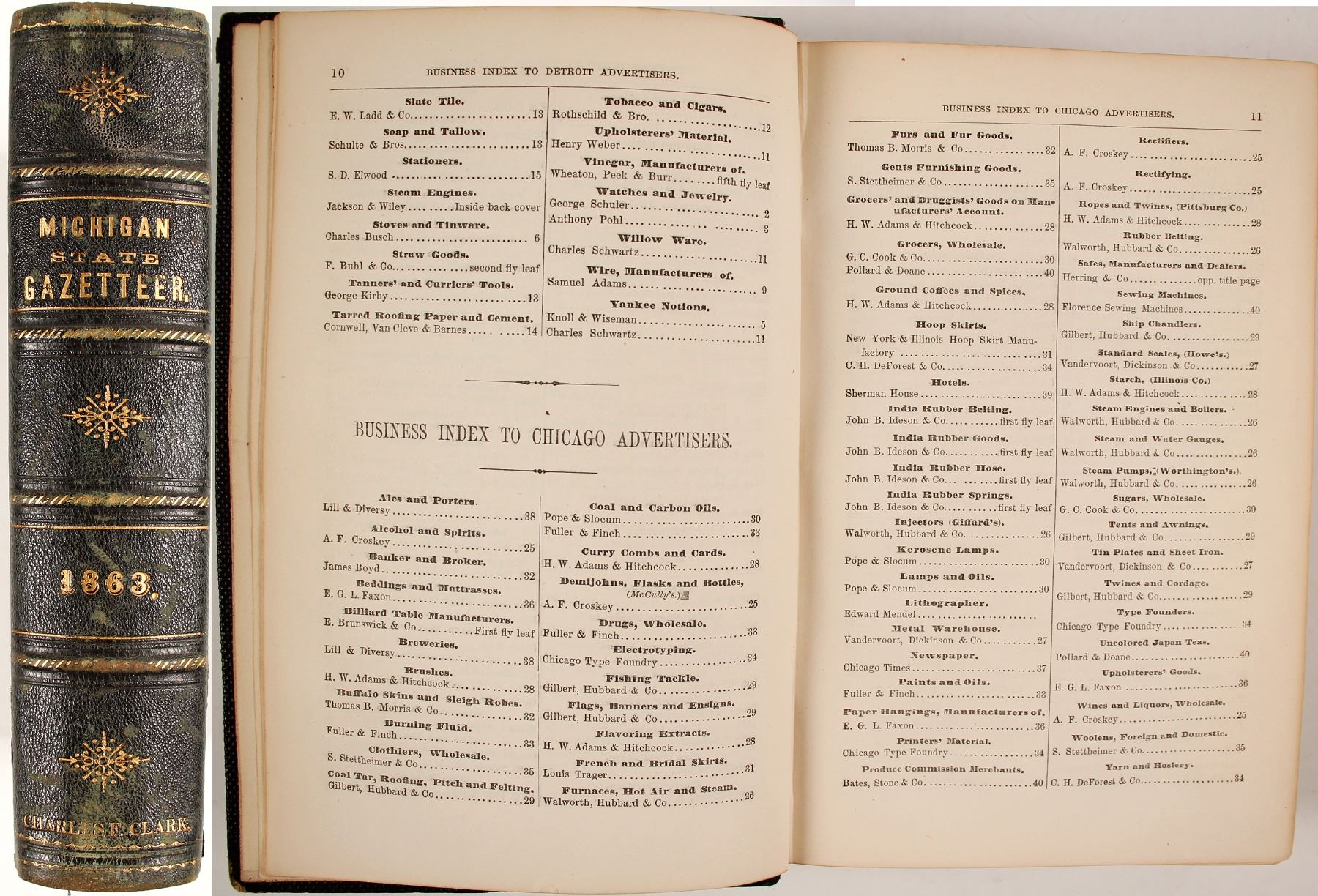 Michigan State Gazetteer and Business Directory for 1863--4, Embracing Historical and Descriptive Sketches of All the Cities, Towns and Villages Throughout the State, Together with Classified Lists of all Professions, Trades and Pursuits, Names of all Organized Companies, State and County Officers, and full information regarding the Mercantile and Manufacturing Interests of the State. Compiles and Published by Charles F. Clarke 1863.