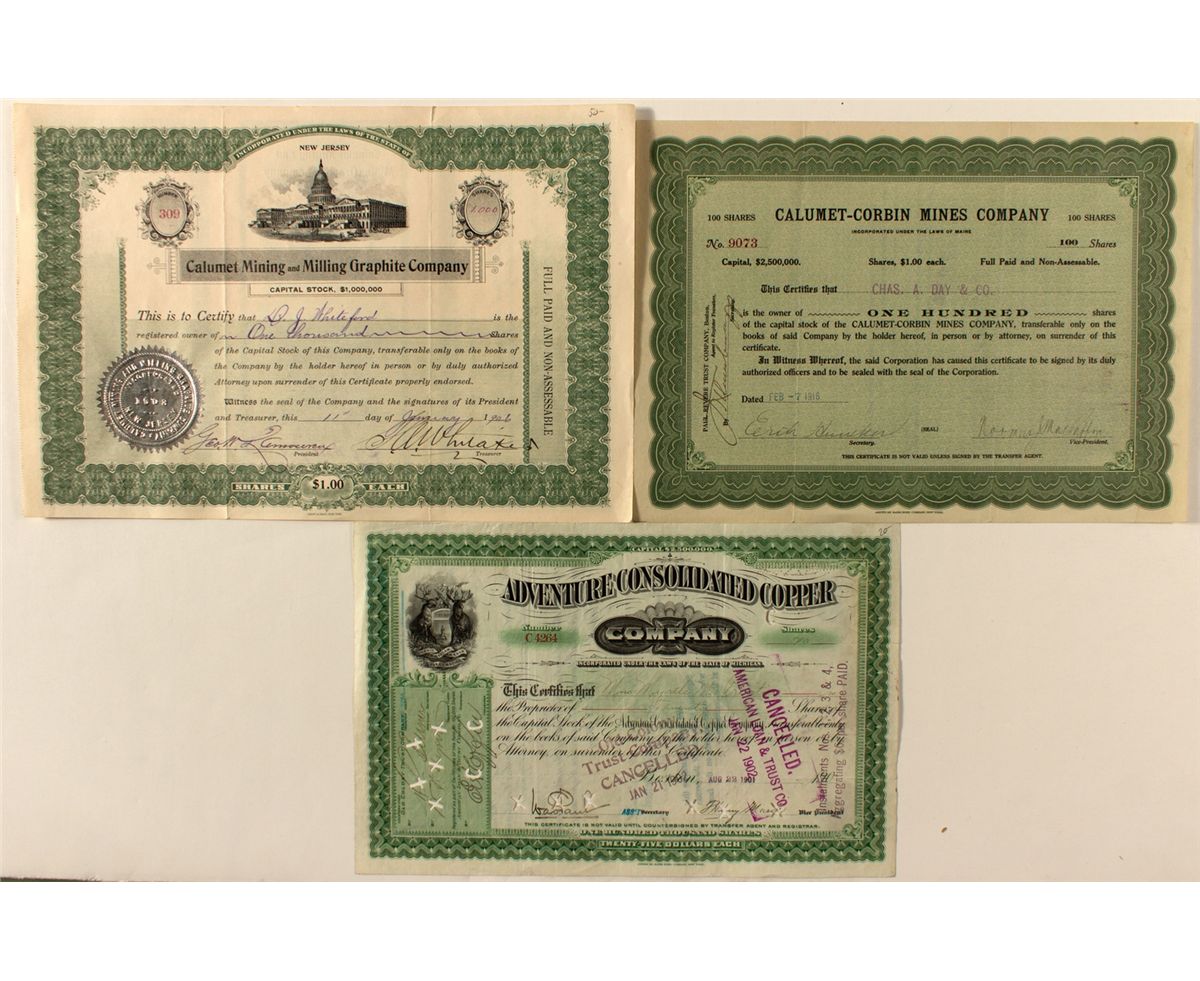 Lot of 3: Adventure Consolidated Copper Co. (cancelled) with 10c revenue stamps on reverse, Calumet-Corbin Mines Co. (uncancelled) with 2c revenue stamps on reverse, and Calumet Mining and Milling Graphite Co. (uncancelled). Lithos by American Bank Note and Adams & Grace, NY. All feature great vignettes, and are in excellent condition. Date c1901 , MI hwac 20325