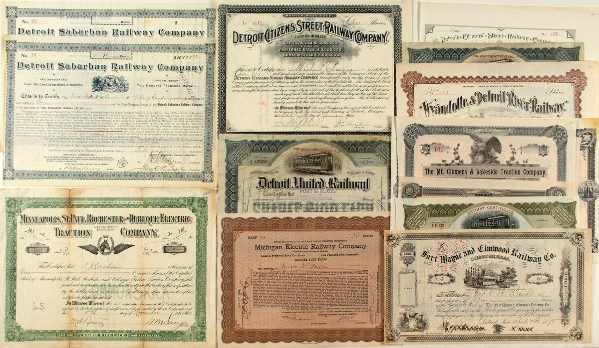 Lot of 15. Includes: Minneapolis, St.Paul, Rochester & Dubuque Electric Traction Co. (1910, not cxl), Wyandotte & Detroit River Railway (unissued 189-), Detroit Suburban Railway Co. (unissued and issued 1892 bond, one unissued stock 189-), Detroit United Railway (unissued 190- and two 1922), Detroit Citizens' Street Railway Co. (unissued 189- and issued 1900, not cxl), Fort Wayne & Elmwood Railway (1875, pen cxl), Fort Wayne & Belle Isle Railway (unissued 189-), Mt. Clemens & Lakeside Traction Co. (two unissued 189-), and Michigan Electric Railway (1924, not cxl). (Prag Collection) City: State: Michigan Date: 1875-1924 hwac# 34501