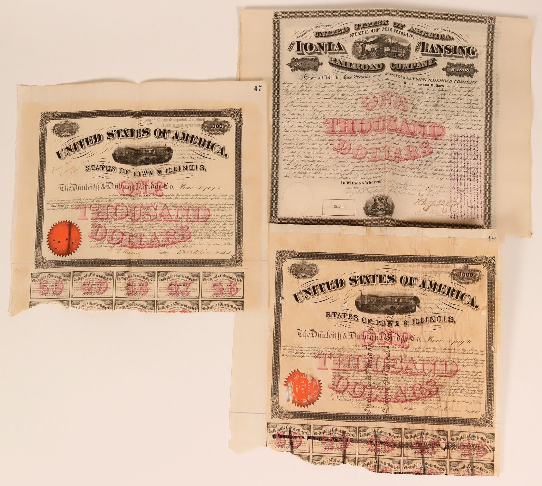4 certificates. 1. Two Ionia and Lansing Railroad Co. incorp. 1865 Michigan. Operated in the state of Michigan in the 1860s and 1870's a 125-mile line from Lansing to the mouth of the Pentwater River at Pentwater, on the shores of Lake Michigan . #45 & 46 of 770 authorized, I/C, $1000, 8% Construction bearer bond issued 1869, signed by Pres. and secretary. Black, embossed seal, vignette 4-4-0 r-l ship in background. Memo of an Agreement attached, ONE THOUSAND DOLLARS in red underprint. The Calvert Litho Co printer. EF