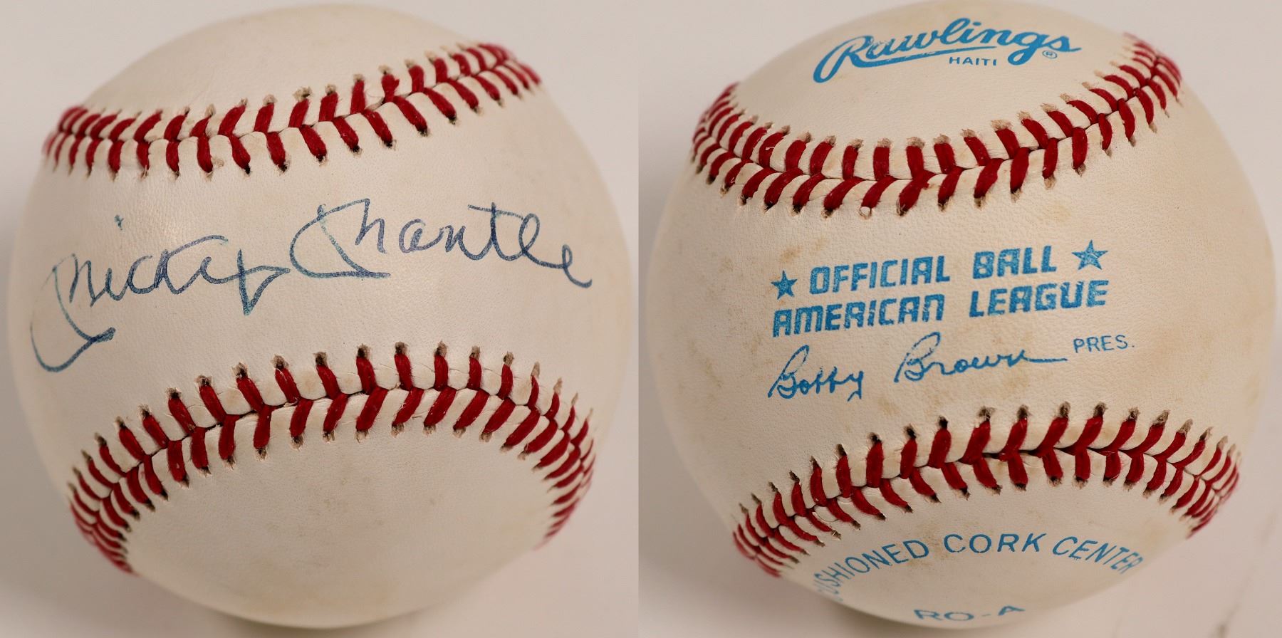 This signed baseball by Mickey Mantle of the New York Yankees. The ball comes in a clear plastic display. Signature in blue ink on the center of the ball. Rawlings baseball RO-A. Ball has a bit of wear.