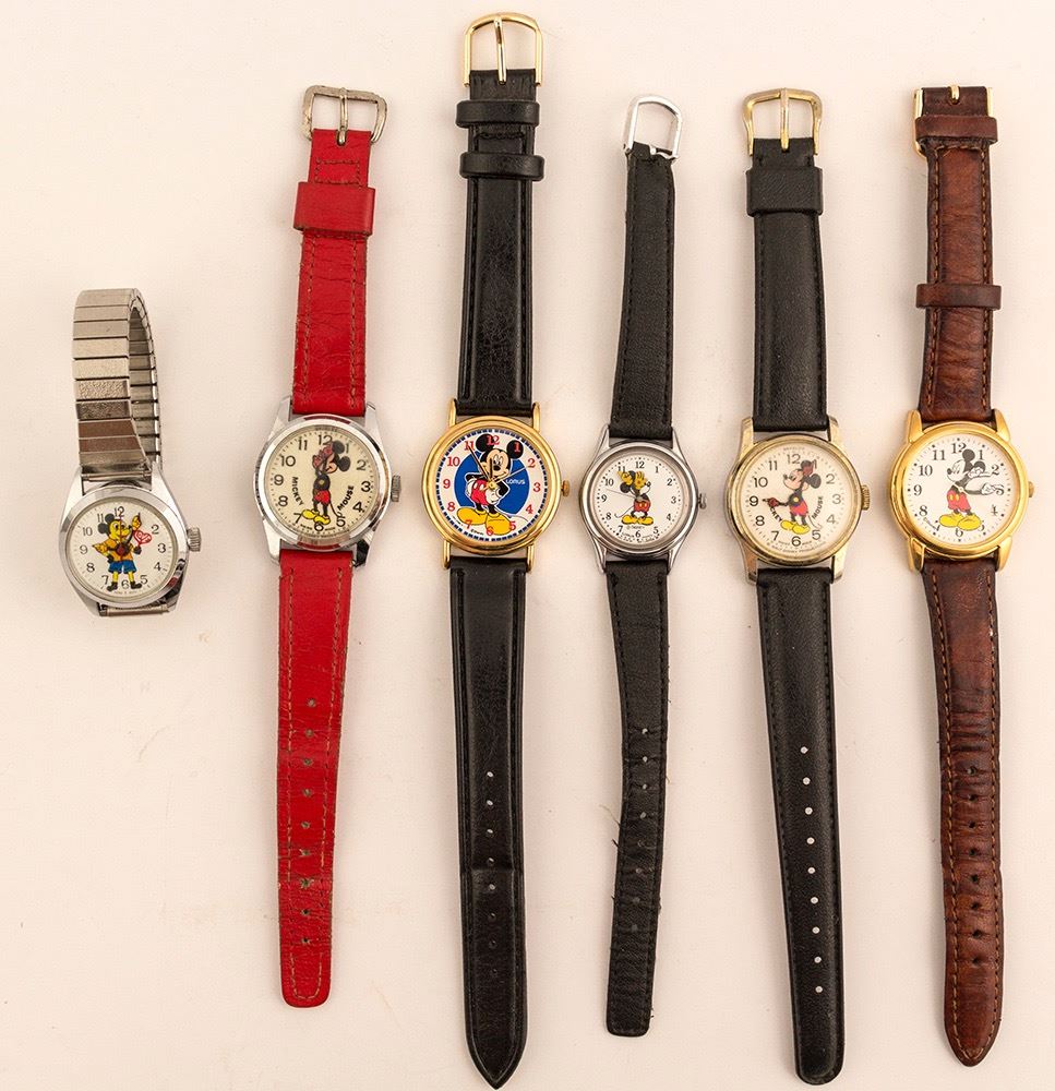 This is a collection of six children's Mickey Mouse watches. All are battery operated, but since the batteries have run down, there is no way of telling as to they work. These are collector's items featuring a very iconic figure in our culture. Date: Location: HWAC# 571802