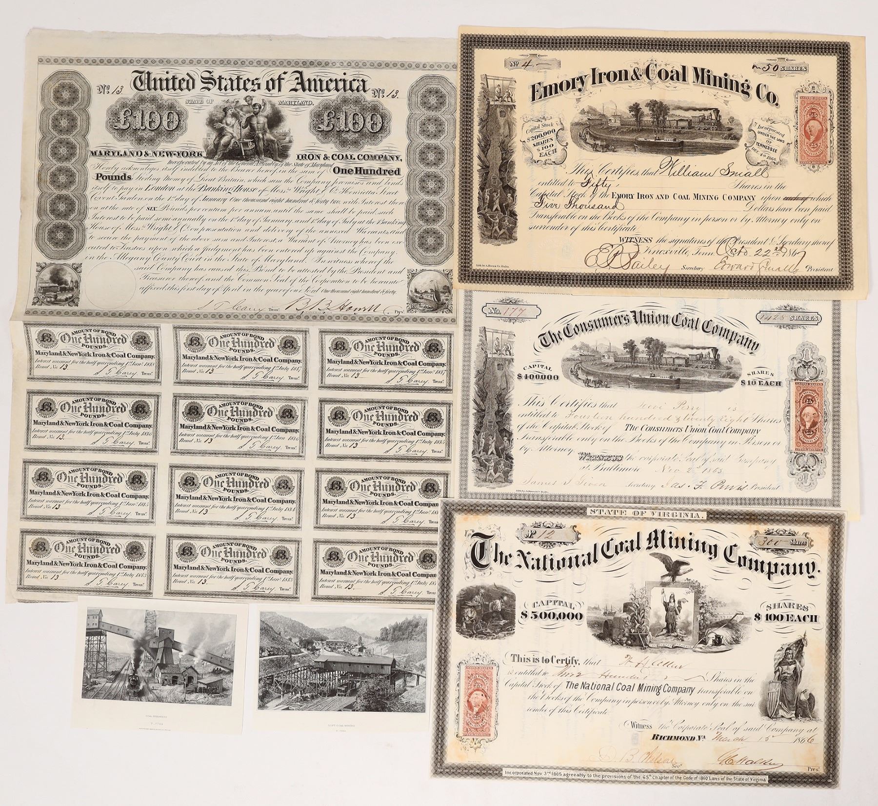4 East coast coal mining stocks. 1866 issued National Coal Mining, Virginia, with brown revenue stamps and underground vignette, light brown toning. 1865 issued Consumers Union Coal, Maryland, with brown revenue stamp and canal barge and train vignette. 1867 issued Emory Iron & Coal Mining, Tennessee, with brown revenue stamp and canal barge and train vignette. Bond, 1840 issued Maryland & New York Iron and Coal with 12 coupons. Train and canal barge vignettes. "The history of coal mining in the United States starts with the first commercial use in 1701, within the Manakin-Sabot area of Richmond, Virginia. Coal was the dominant power source in the late 1800s and early 1900s, and although in rapid decline it remains a significant source of energy in 2023. Coal became the largest source of energy in the 1880s, when it overtook wood, and remained the largest source until the early 1950s, when coal was exceeded by petroleum. Coal provided more than half of the nation's energy from the 1880s to the 1940s, and from 1906 to 1920 provided more than three-quarters of US energy. Anthracite (or "hard" coal) exploitation began before the War of 1812 spurred by the interest and opportunism of the Wurt brothers of Philadelphia. Burning clean and smokeless, anthracite became the preferred fuel in cities, replacing wood by about 1850, the same pattern seen in Europe. The East became deforested, driving up price of fuel wood. Anthracite from the Northeastern Pennsylvania Coal Region and later from West Virginia was valued for household use because it burns cleanly with little ash. It was also used in the early foundries of Philadelphia, New York, Newark and Allentown. The rich Pennsylvania anthracite fields were close to the big eastern cities, and nearly every major railroad in the Eastern United States such as the Reading Railroad, Lehigh & Erie, Central Railroad of New Jersey, Pennsylvania Railroad and Delaware and Hudson Railroad, extended lines into the anthracite fields. Many railroads began as mining company shortline railroads. By 1840, annual hard coal output had passed the million-short ton mark, and then quadrupled by 1850, and as it grew it pushed railroad construction, mining and steel production in a synergistic symbiosis." from wikipedia Herzog Collection