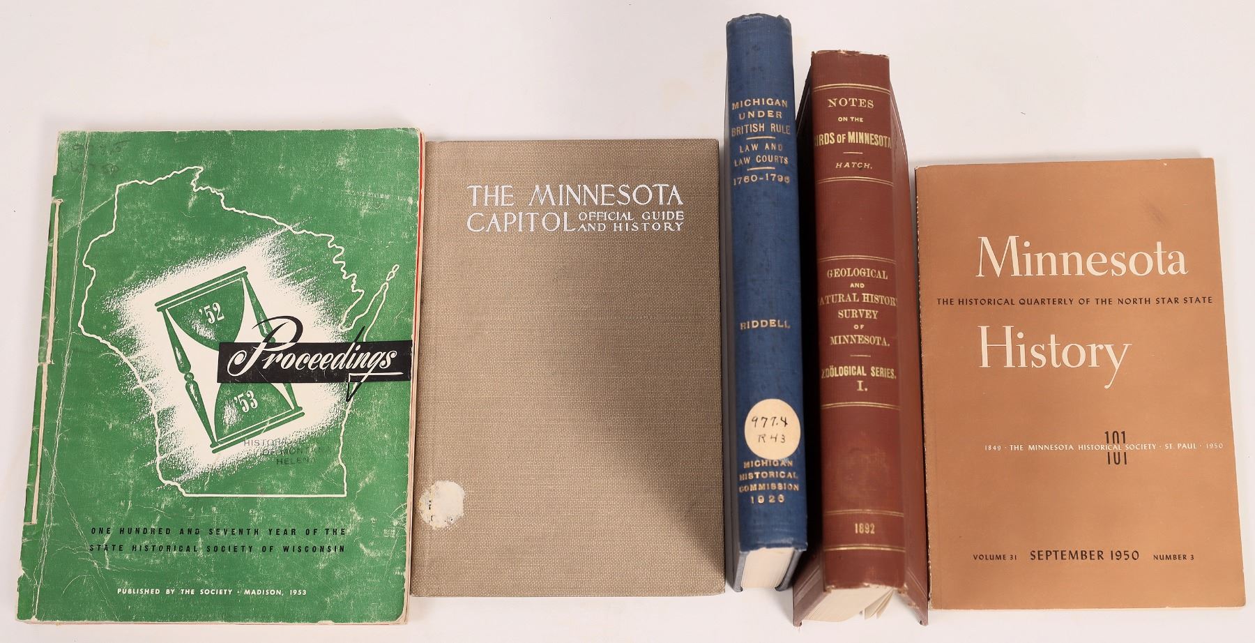 Proceedings of State Historical Society of Wisconsin 1952-58. Michigan Under British Rule 1760-1796 by Riddell. Notes on the Birds of Minnesota by Hatch with hundreds of species and index. Minnesota History 1950. The Minnesota Capitol, Official Guide and History by Gauthier 1907-lots of Capitol illustrations.