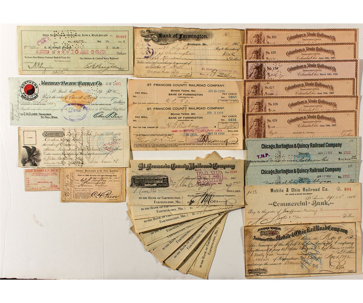 31 pieces. Includes: Columbus & Xenia Railroad Co. (illustrated, c. 1920s), Chicago, Burlington & Quincy Railroad (1913), Mobile & Ohio Railroad Co. (1872 and 1886), Des Moines & Central Iowa Railroad (1933), St. Francis County Railroad Co. (many pictorial), Northern Pacific Railway Co. (1899), and two tickets for Chicago, Milwaukee & St. Paul Railway. (Prag Collection)