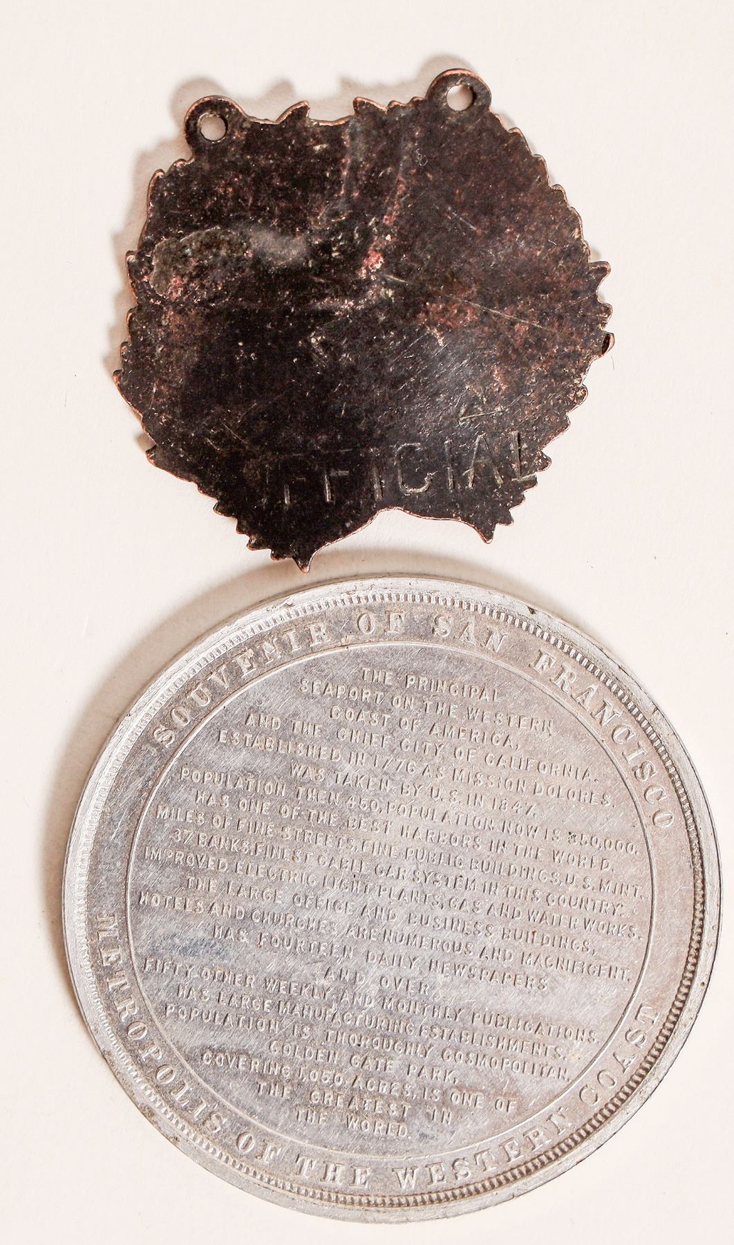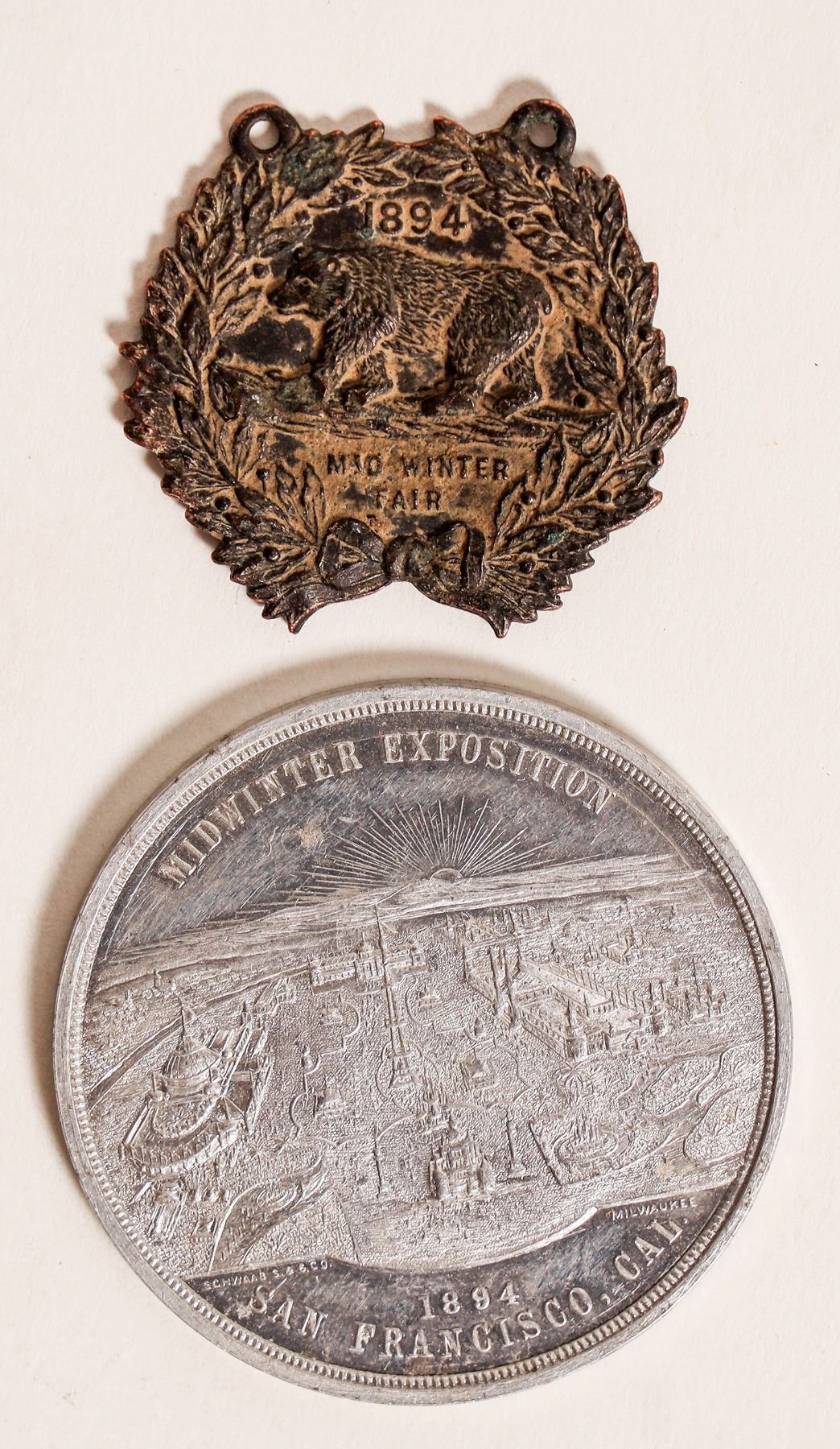 Michael H. DeYoung was the mastermind behind the California Midwinter International Exposition of 1894, that operated from January 27 to July 5 in San Francisco's Golden Gate Park. Here are two souvenirs from the Expo: 1) beautiful uncirculated aluminum medal with panorama of the Park on one side and about 22 lines of prose on the reverse proclaiming the virtues of San Francisco "Metropolis of the Western Coast." 44 mm. 2) Official's badge (31 x 26 mm) with top holes for hanging and the California grizzly bear. [San Francisco] [California]