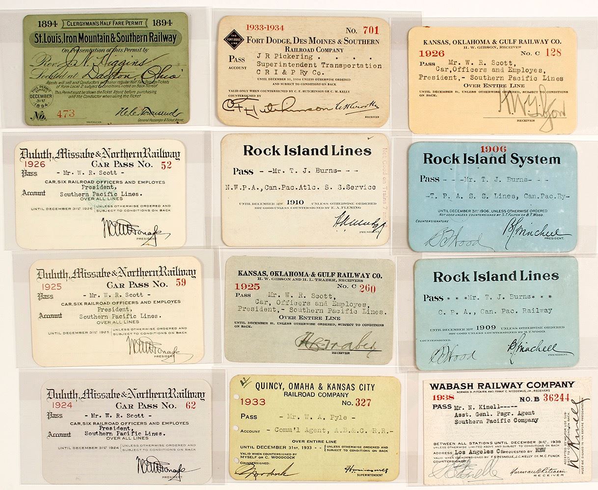 Lot of 12 passes from seven different railroads. Included: Fort Doge, Des Moines & Southern Railroad (1933); St. Louis, Iron Mountain & Southern Railway (1894 clergyman's permit); Duluth, Missabe & Northern Railway (1924, 1925, 1926); Rock Island System (1906, 1909, 1910); Kansas, Oklahoma & Gulf Railway (1925, 1926); Wabash Railway Company (1938); and Quincy, Omaha & Kansas City Railroad Co. (1933). (Potter Collection) HWAC# 59990 Date: 1894-1938 Location: