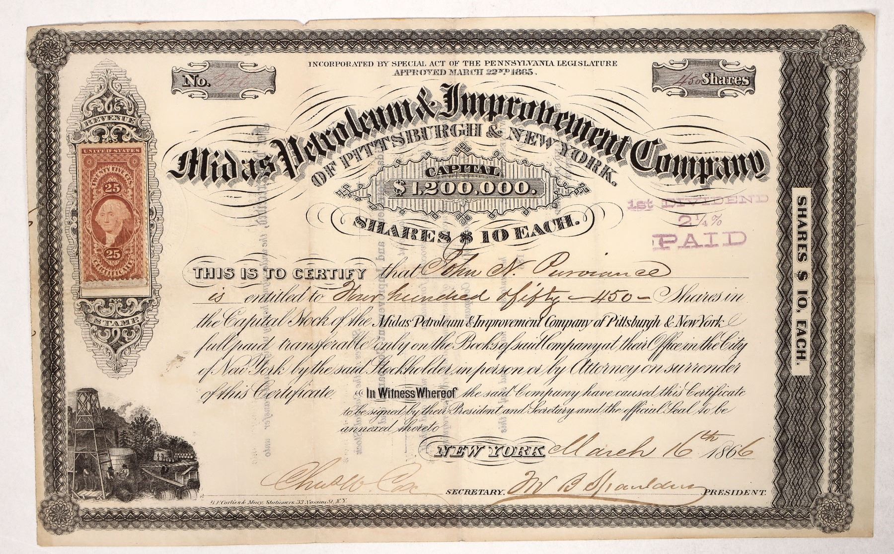 Inc. in Pennsylvania, 1865. No. 276, issued for 450 shares to John N. Purviance in New York in 1866. Signed by president Spaulding and secretary Chas. Case. Not cancelled. Ornate black border and print with oil derrick vignette at bottom left. Printed by Corties & Macy, NY. 25 cent US IR certificate adhesive revenue stamp attached at upper left. Deep folds and creases. 6.75 x 11". Oil properties in Warren County, PA, and some at Oil City. Reporting dividends 30 years later in the 1890s.