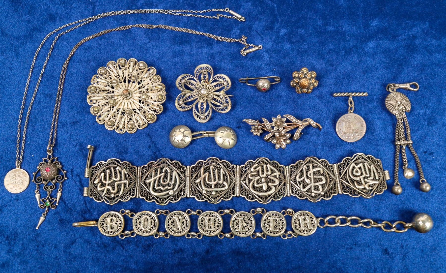 Vintage Middle Eastern jewelry, open work silver designs--2 bracelets, 3 pendants, two on chains, 5 pins, 2 different cufflinks. Please Inspect