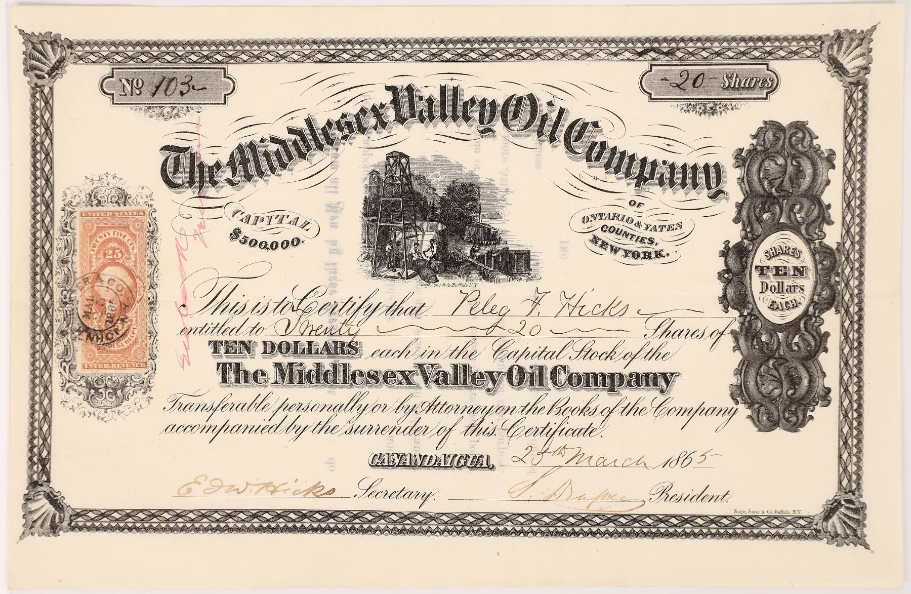 "of Ontario & Yates Counties, New York." (printed to the right of oil derrick vignette). No. 103, issued for 20 shares to Peleg Hicks in Canandaigua in 1865. Signed by president S. Draper and secretary E. Hicks. Black border and print. 25 cent US IR Warehouse Receipt adhesive revenue stamp attached on the left with tied cancel. Printed by Sage, Sons & Co., NY. Folds. 6.75 x 10.5" New York Ken Prag Collection