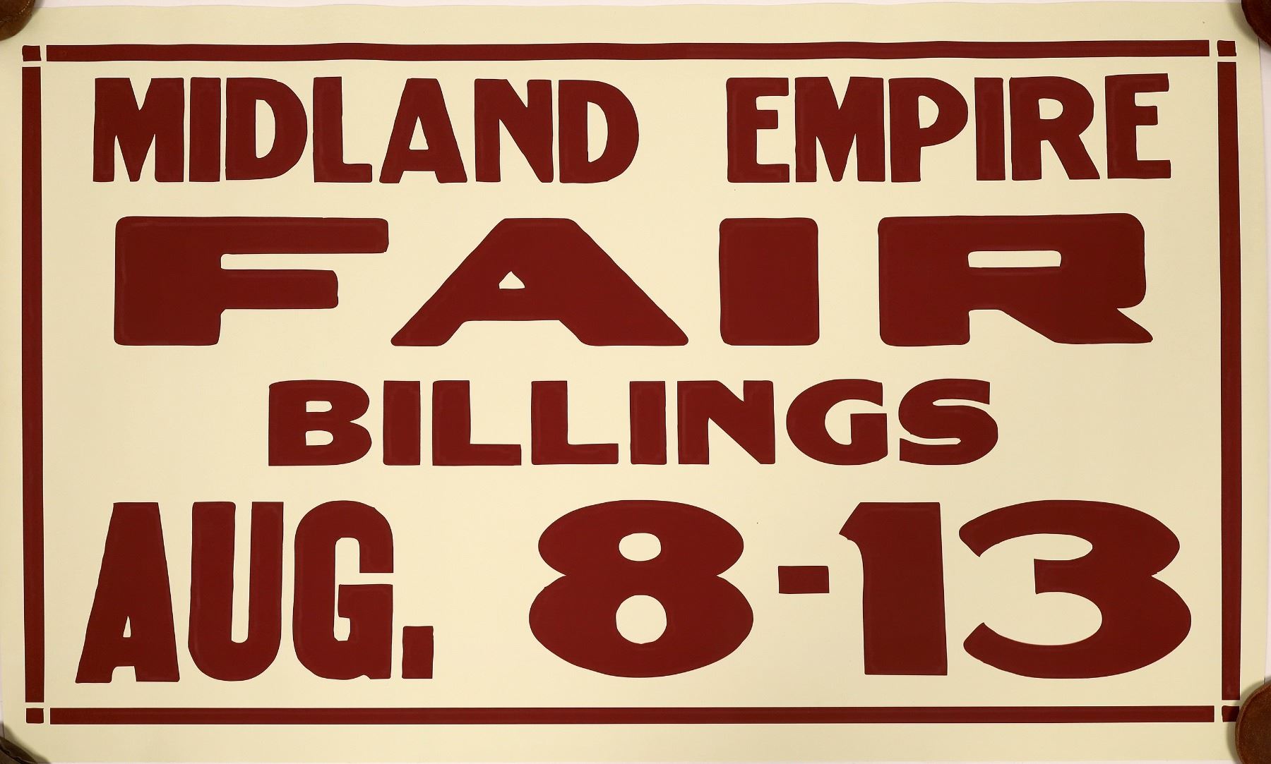 This poster advertising for the "Midland Empire Fair" is paper on heavy canvas for the week Aug. 8th-13th, 1949. 44 inches X 28 inches It is in excellent condition without any perfs. A vibrant color burgundy on a cream background. From the Stuart MacKenzie collection.