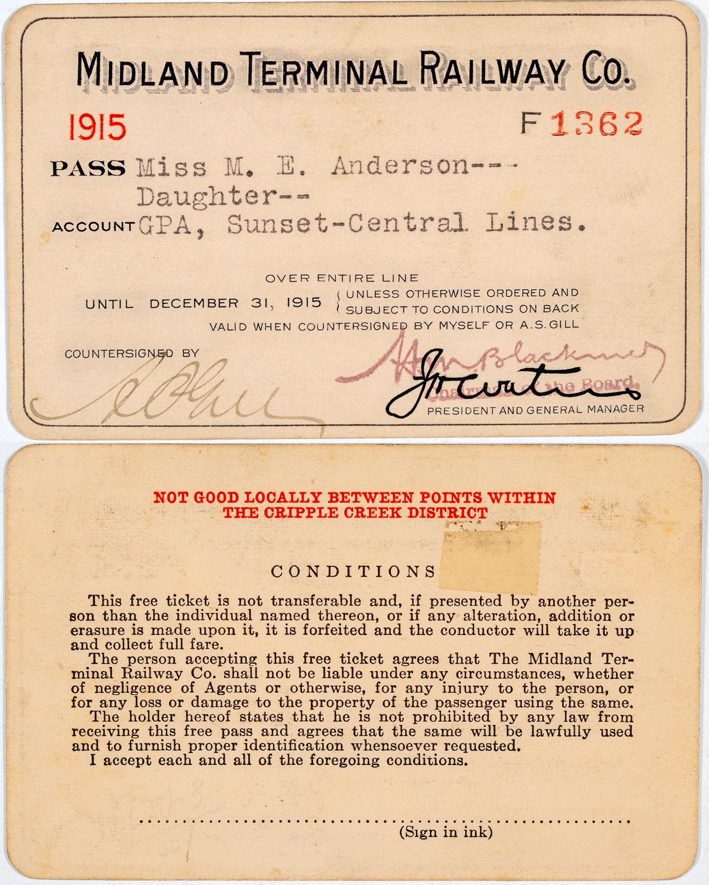 Rare. Pass no. F1362, issued for 1915 to Miss ME Anderson, daughter of GPA for Sunset Central Lines. Preprinted sig. of president. Countersigned by AS Gill. Reverse states "Not good locally between points within the Cripple Creek Mining District." Black print on tan cardstock. Tape residue on reverse. From 1887 to 1918, this railroad had service along a 222-mile line route from Colorado City, through Ute Pass and across the Continental Divide, to New Castle. It was the first standard gauge railroad through the Rocky Mountains.
