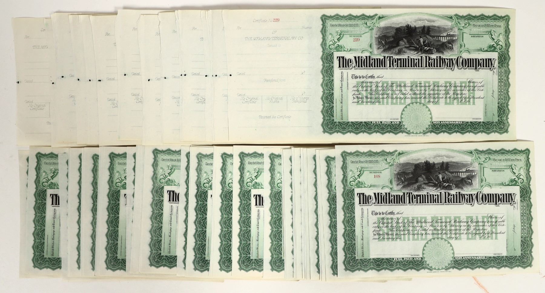 Group of approx. 100 unissued stocks from the Midland Terminal Railway Company, a notable railway company in the Cripple Creek mining area. Certificates are dated 18XX. Nice vignette of builders at work watching the railroad. Good condition overall, with some toning due to age; see photos.