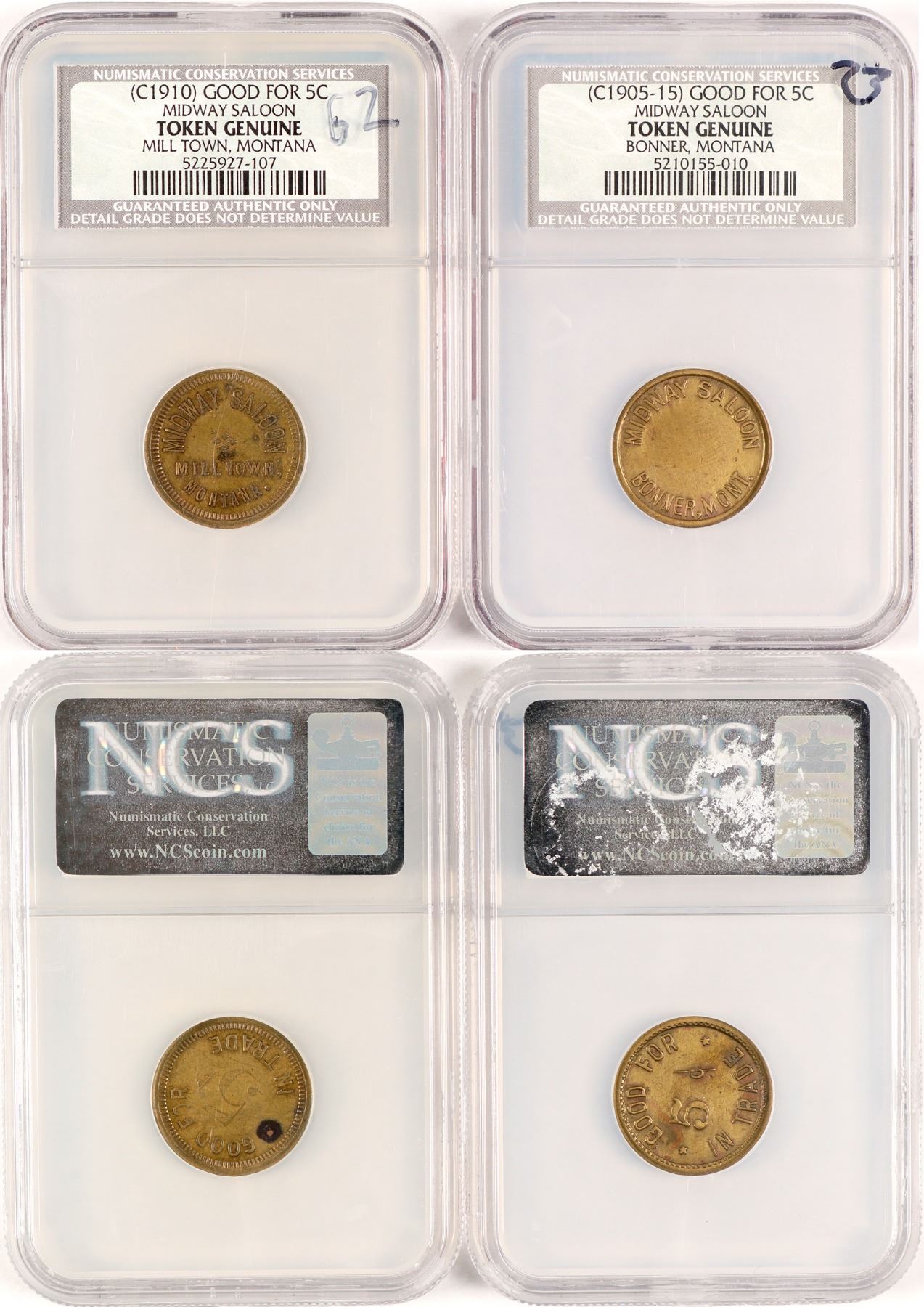 Lot of two Midway Saloon tokens, one from Bonner and one from Milltown, both GF 5c, both NCS certified genuine. City: Milltown State: Montana Date: