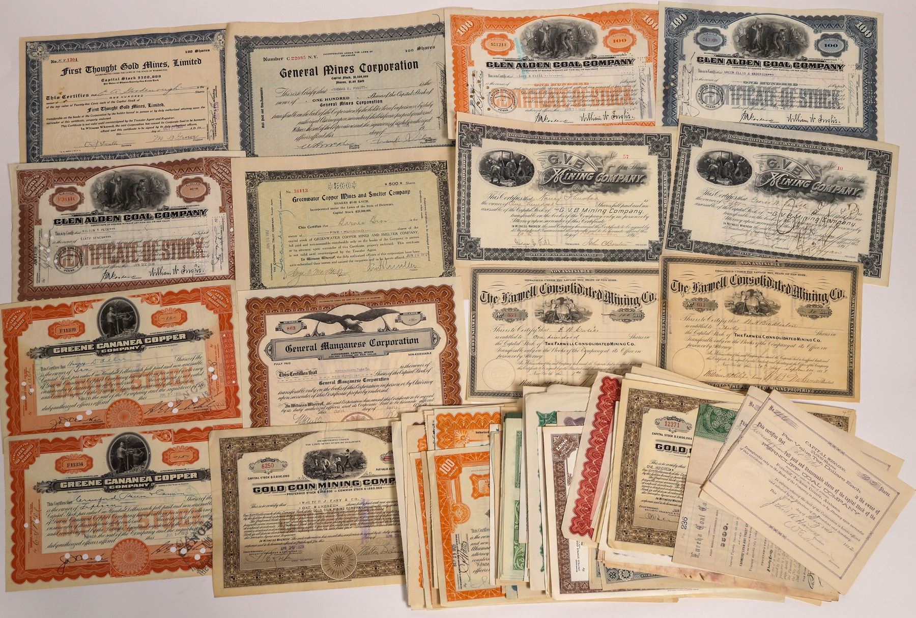 Over 120 mining stocks from Midwestern, Eastern and Southern states. Mostly coal, but also copper, gold, manganese and others. Some from the 1890s, most 20th century. State: City: Date: Provenance: Ken Prag Collection