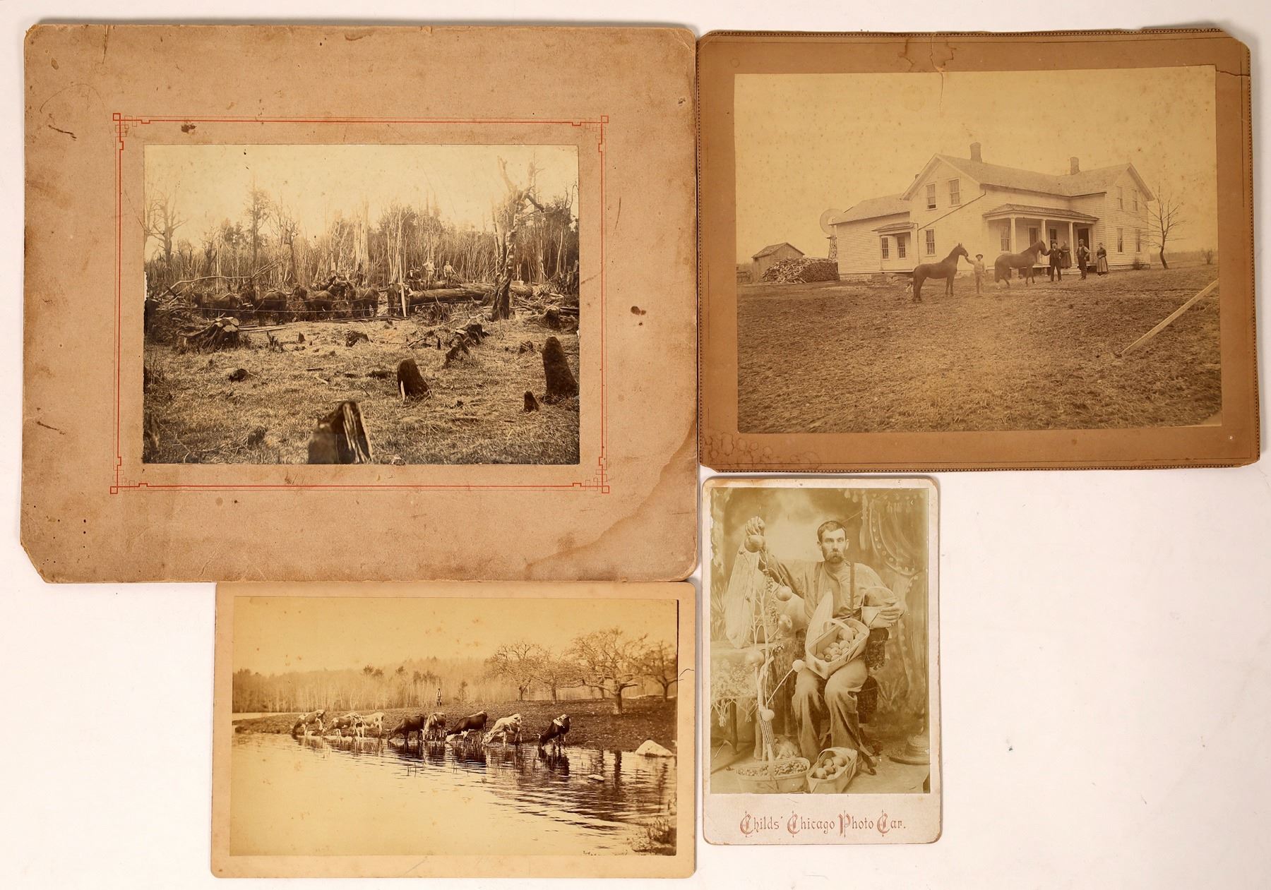 Lot of 4. B/W mounted photos w/borders. 1. Farmer posing w/fruits and vegetables. 2. Cows drinking. 3. Farm house w/ occupants showing horses. 4. Logging horse team pulling logs. All in very god condition.