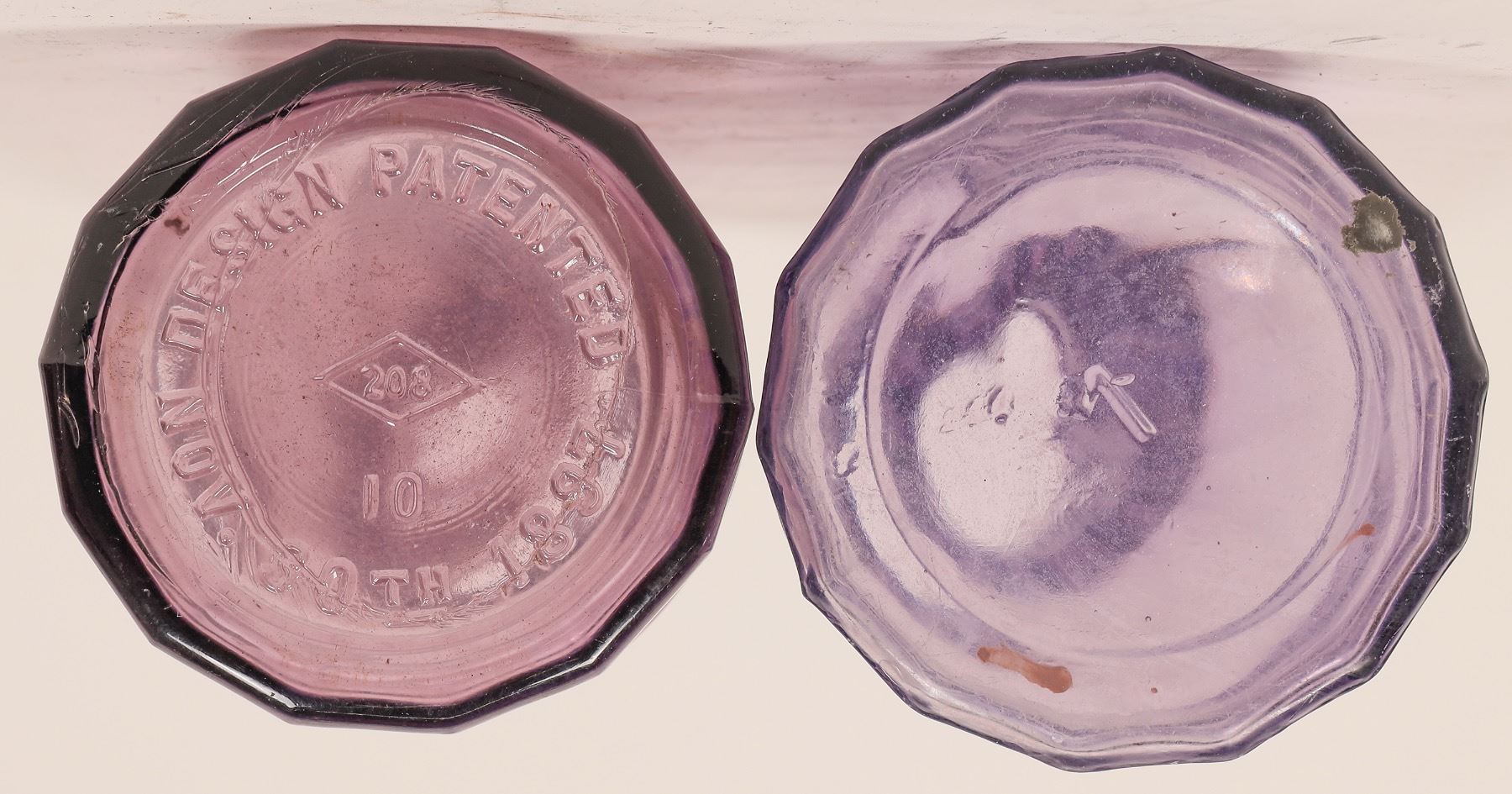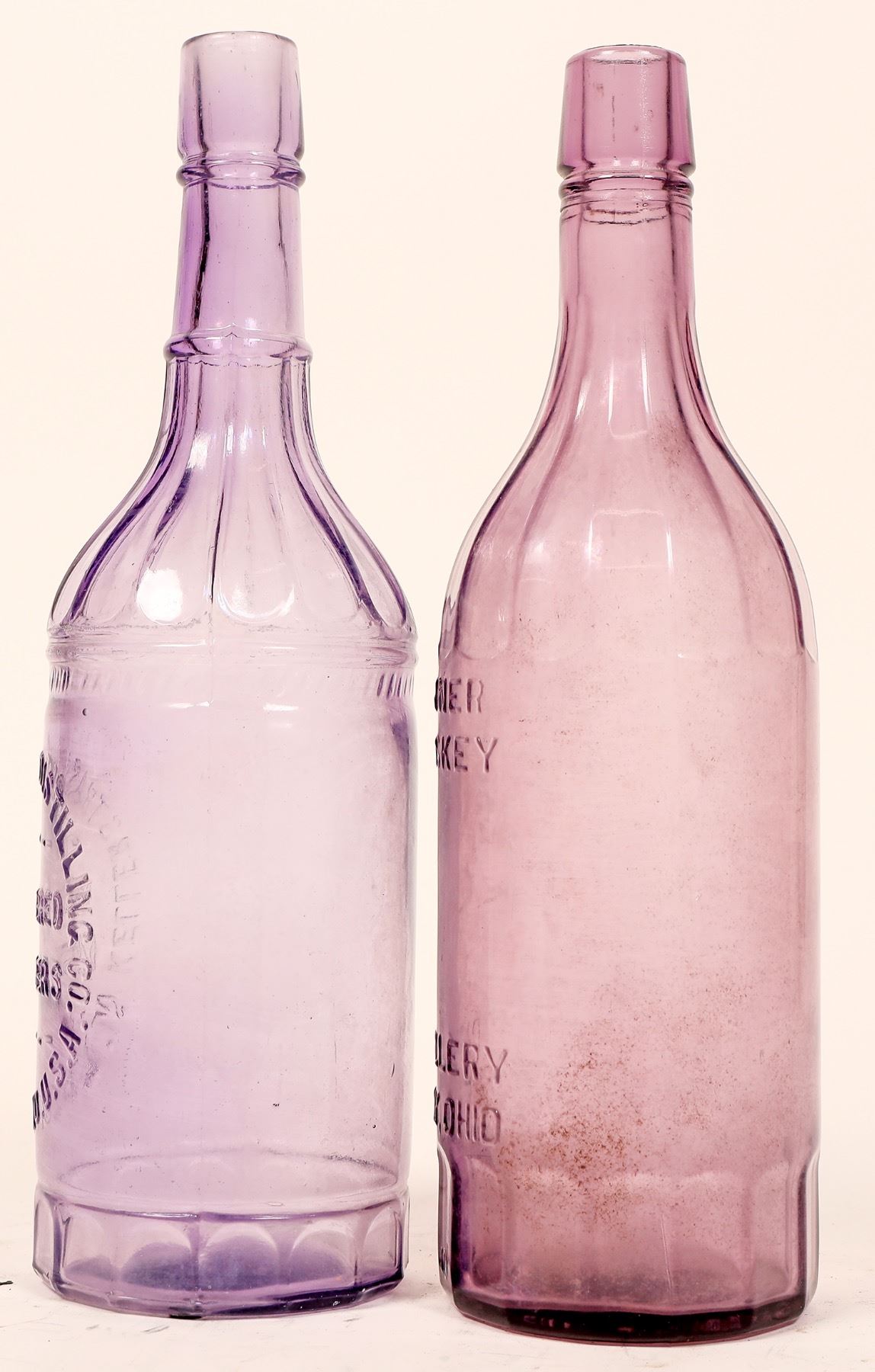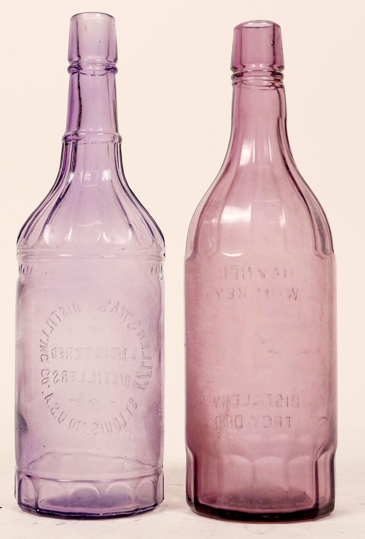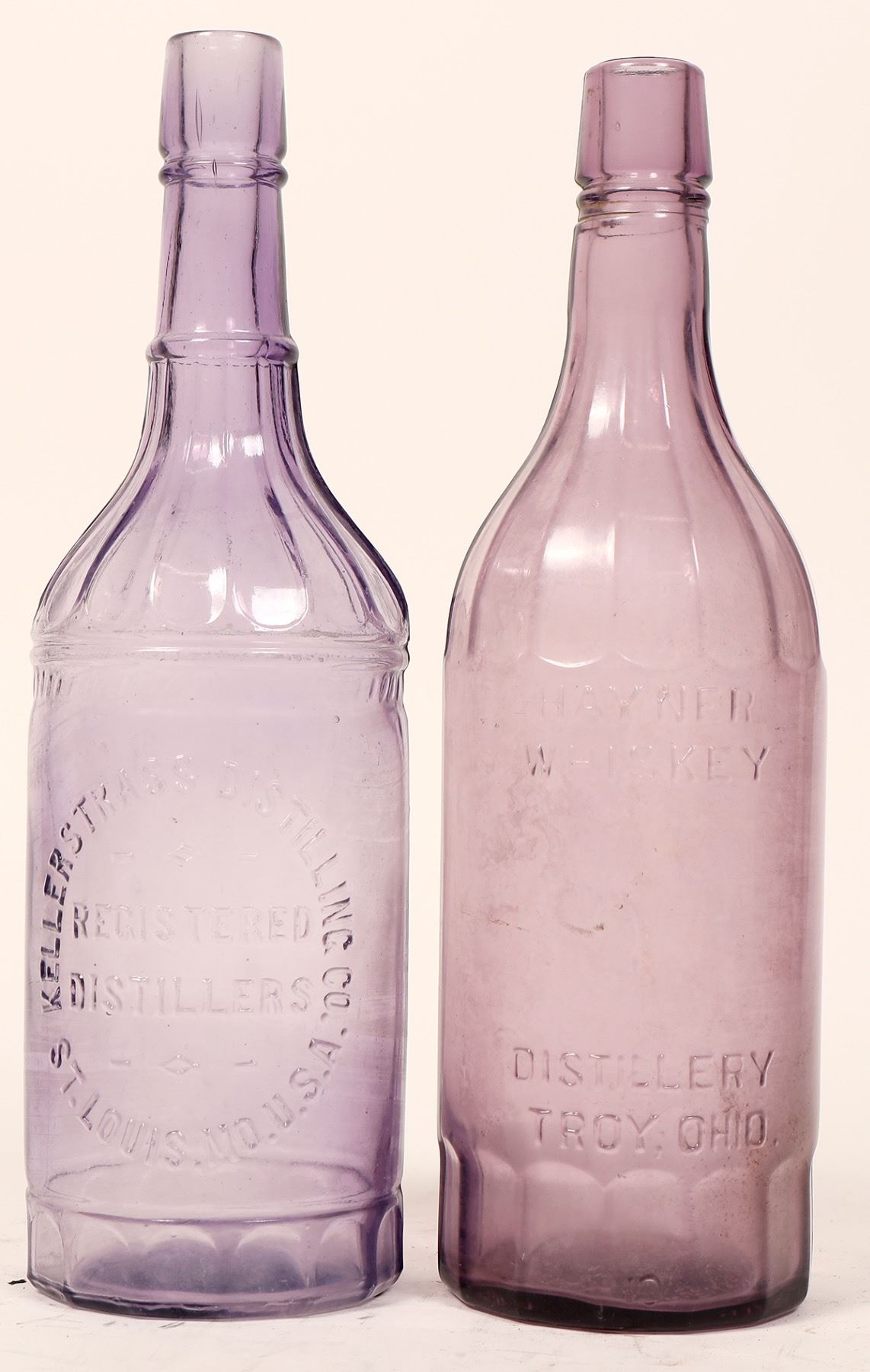 2 purple fifths with fluted shoulders. Hayner/Whiskey/Distillery/Troy Ohio. Scarce tooled top Kellerstrass Distilling Inc./Registered/Distillers/St. Louis, MO. USA.
