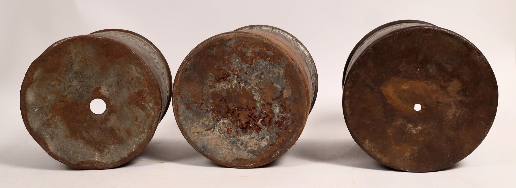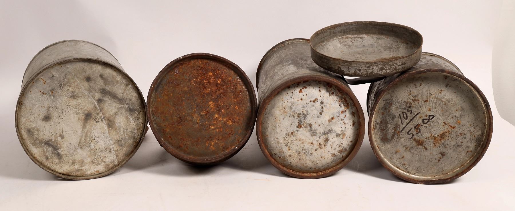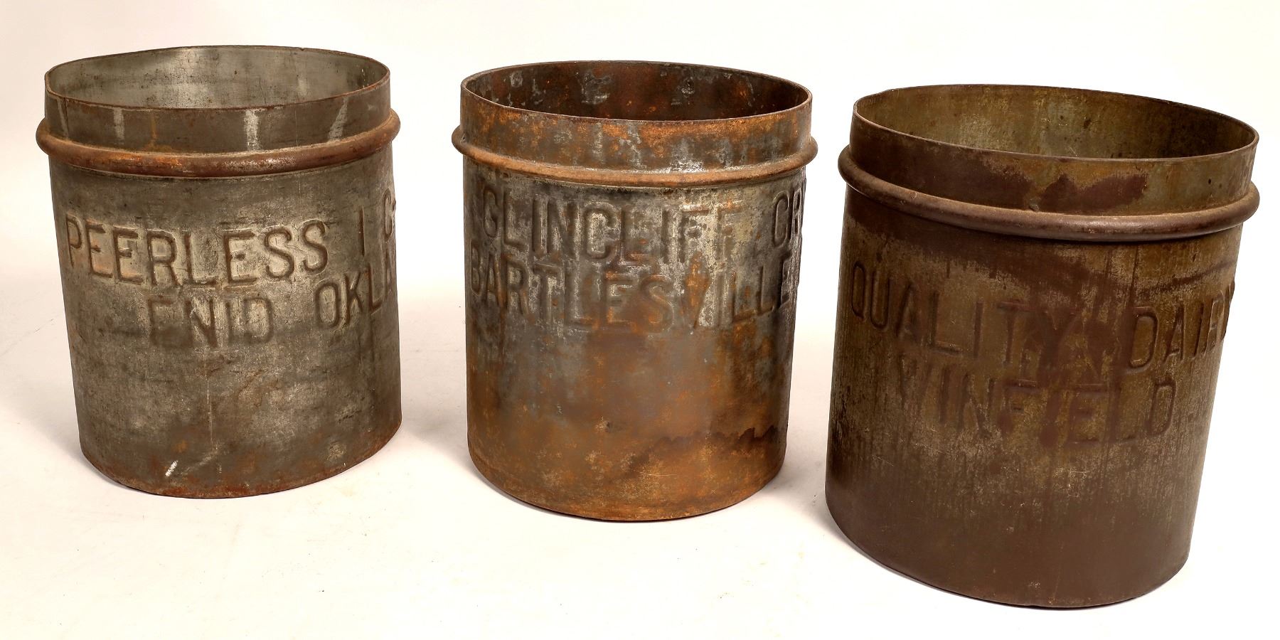 7 different Midwest dairy cans. De Coursey 57/Wichita Kans 18", Peerless IC-41/Enid Okla 10", Glincliff Cry/Brili? Okla 10", Steffens O. C 30 19", Quality Dairy/Winfield 10", Borden's/Kansas City Missouri 14", Gateway Dairy/Company/Joplin, Missouri 8".