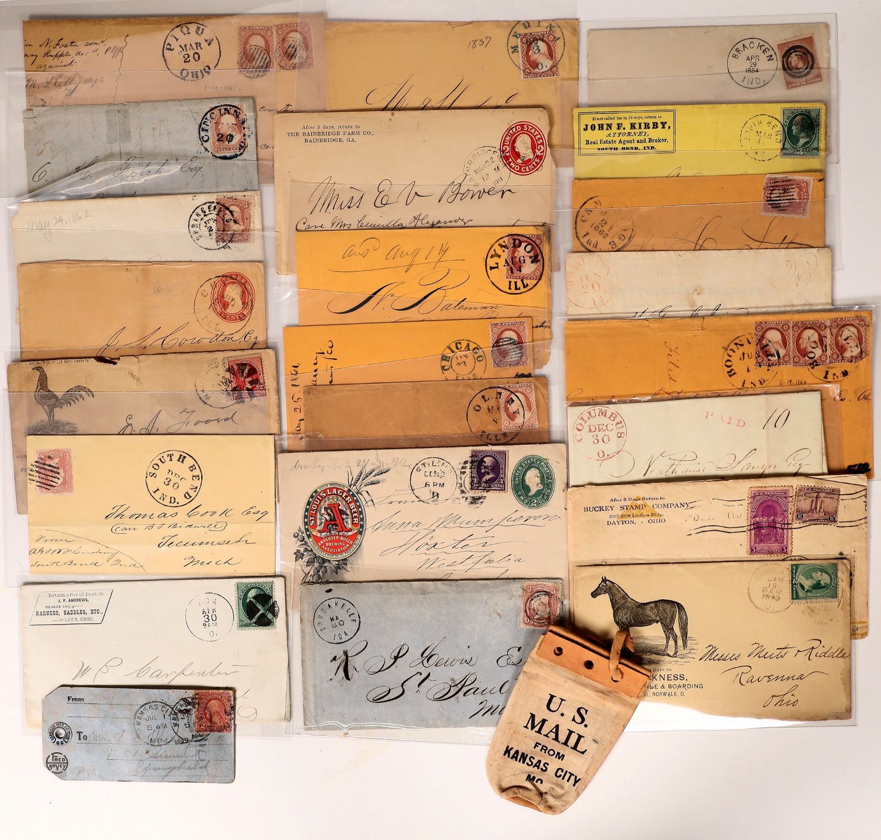 1)Missouri: Bright colorful St. Louis Lager, Anheuser Busch brewing; 1911 advertising cover for Bainbridge Farm with letter on JD Bower letterhead. 2) Indiana: South Bend c1870; John Kirby of South Bend advertising; Cambridge c1870, printed state notice; Bonville 1860; and most appropriately a Bracken. Indiana 1884 cover! 3) Illinois: GW Pratt breeder of games Wauconda; 1838 Lyndon, Springfield double Circle; 1861 Chicago double circle; early Olney, 4) Missouri: 1855 St. Louis lettersheet; 1861 Piqua; 1857 Medina; 1837 Columbus stampless letter; Buckey Stamp Collection with two rather unique 3c stamps; Advertising cover for Andrews Harness and Saddles; and a great looking horse vignette on a Harkness of Norwalk advertising cover. Lot of 24!