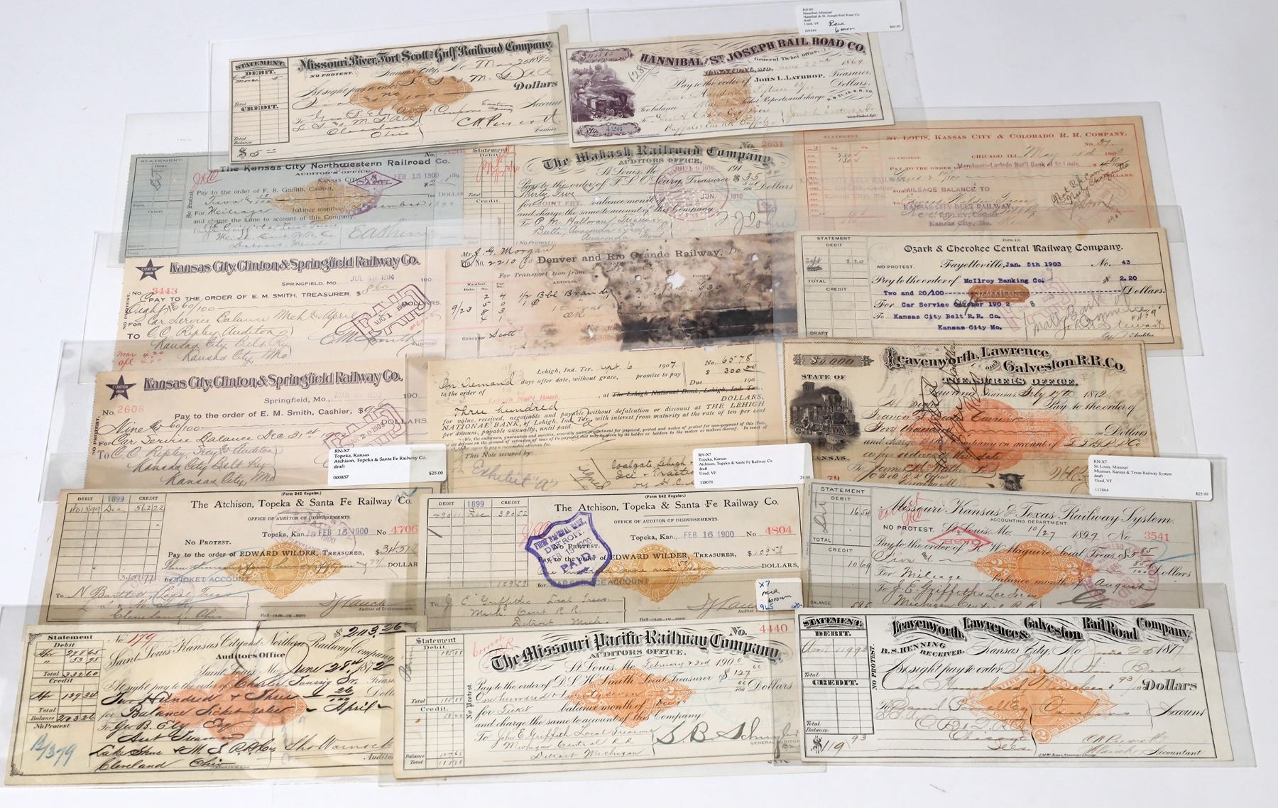 Lot of Seventeen. Includes Hannibal & St. Joseph with RN-B. Steam train vignette. Missouri River, Fort Scott & Gulf. RN-D. Leavenworth, Lawrence, Galveston. RNG. Missouri Pacific (RNX), St. Louis, Kansas City & Northwestern RND, Missouri Kansas & Texas (RNX), Atchison, Topeka & Santa Fe (RNX), Leavenworth, Lawrence, Galveston (RNC), Kansas City Northwestern (RNX). See photo for more.