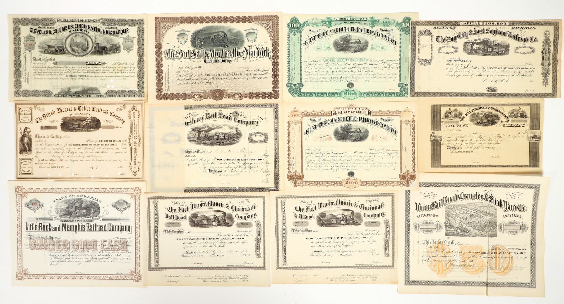 Lot of 13 unissued. Includes: Cleveland, Columbus, Cincinnati & Indianapolis Railway; Detroit, Monroe & Toledo Railroad; Flint & Pere Marquette RR; Fort Wayne, Muncie & Cincinnati RR; Bay City & East Saginaw; Little Rock & Memphis RR; Union Rail Road Transfer & Stock Yard Co.; and more. Please inspect.