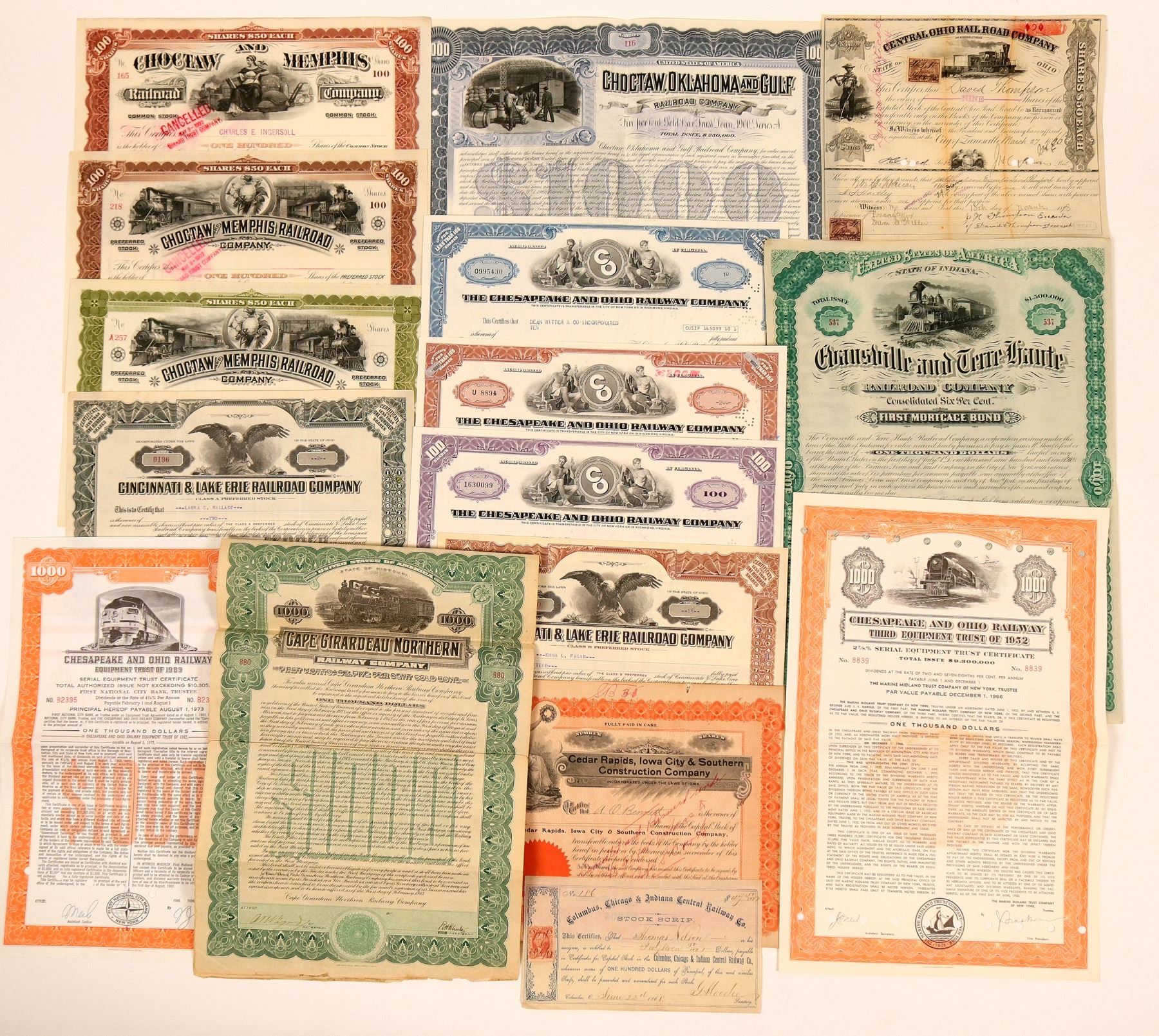 Lot includes one nice bond from Choctaw, Oklahoma and Gulf Railroad Co., and one from Evansville and Terre Haute Railroad Co. , which is not fully issued. Punch holes. Also, three certificates from Choctaw and Memphis Railroad Co., and one from central Ohio Railroad Co. , 1866. Other stocks included view photos.