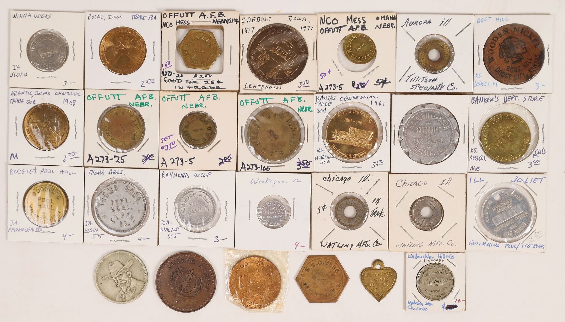 Lot of 27 tokens from Midwestern states: Nebraska (6): Offutt Air Force Base. Iowa (7): 100th Anniversary, Boone; Raymond Wolf, Walnut; Winna Vegas, Sloane; 1968 Atlantic Centennial; Thoma Bros., Elgin; Boogie's Pool Hall, Hawarden; 1977 Centennial, Odebolt. Kansas (4): 1961 Kansas Centennial; Eisenhower Center, Abilene; Boot Hill, Dodge City; Banker's Dept. Store, Russell. Illinois (10): Lithuanian Auditorium, Waukegan; Willoughby Hill & Co., Chicago; Chicago Colonial Saloon; Palmolive-Peet, Chicago; 1940 dog tag, Elmwood; J. D. Williamson, Watson; Tillitson Specialty, Aurora; Watling Mfg. (2), Chicago; Joliet Park District.