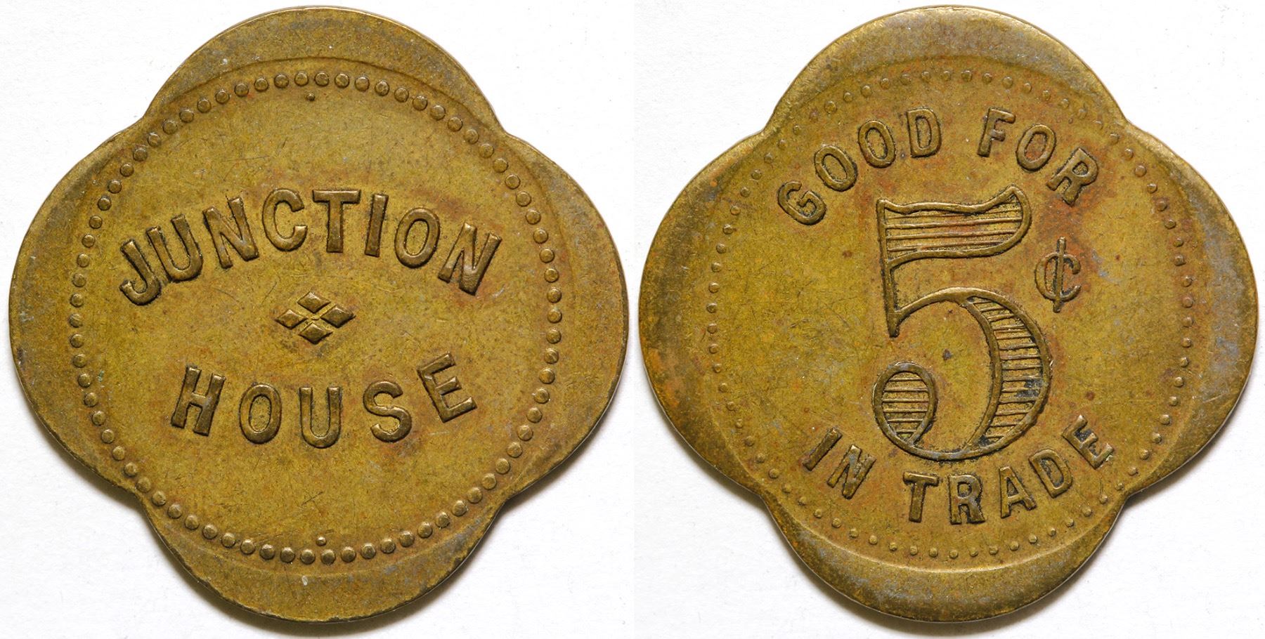 Scalloped, brass 27mm, JUNCTION/ HOUSE//GF/ 5C/IT. MILANO JUNCTION 2 RR JUNCTION 2 MILES EAST OF MILANO. HWAC# 62511 Date: 1881 Location: Milano Junction House , Texas