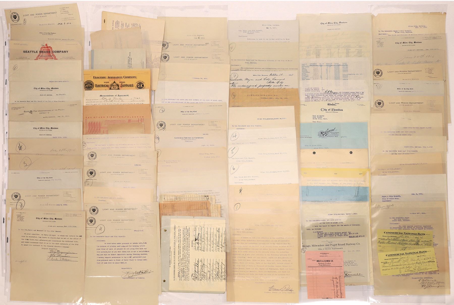 Lot of approx. 220 pieces, all to/from the city of Miles City, MT. Correspondence from the City Clerk as well as the Mayor and City Council predominate this collection. Most correspondence c. 1910 - 1920 with a few pieces dated 1922 - 1924. All items in large 3-ring binder. Note: Miles City is located in southeastern MT in Custer County. It was founded in 1877 and incorporated ten years later. The community is named after US Army General Nelson A. Miles. State:Montana City:Miles City Date: Provenance: Stuart Mackenzie Montana Ephemera Collection